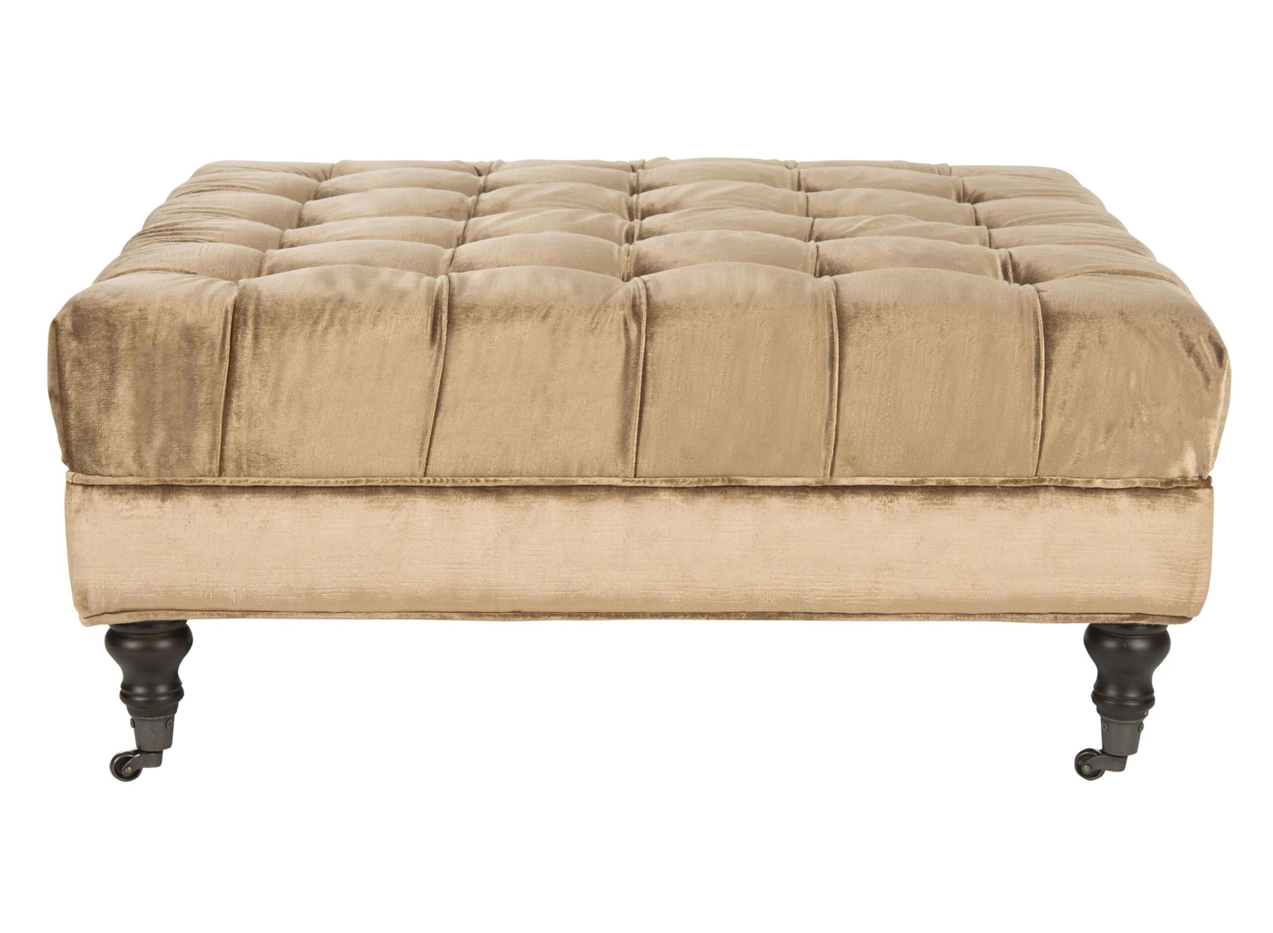 The Rowan Cocktail Ottoman is an indulgence in any living room or den. Richly upholstered with button tufting in golden olive cotton viscose, Rowan rests on turned arrow birch legs in an espresso finish.