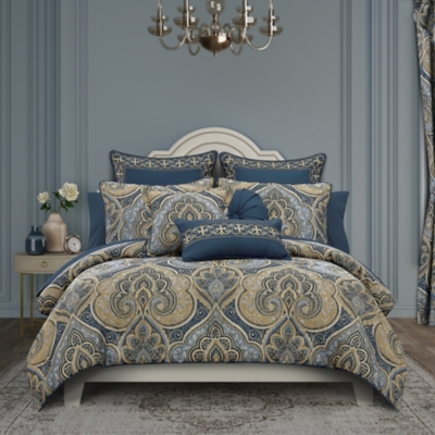The Messina Navy Comforter Set features a highly detailed printed damask design in shades of navy blue and light shimmery gold. Paired with matching shams that pulls the beauty all together. Pair this bedding collection with the Messina Navy throw pillows, Euro shams, and window treatments for a