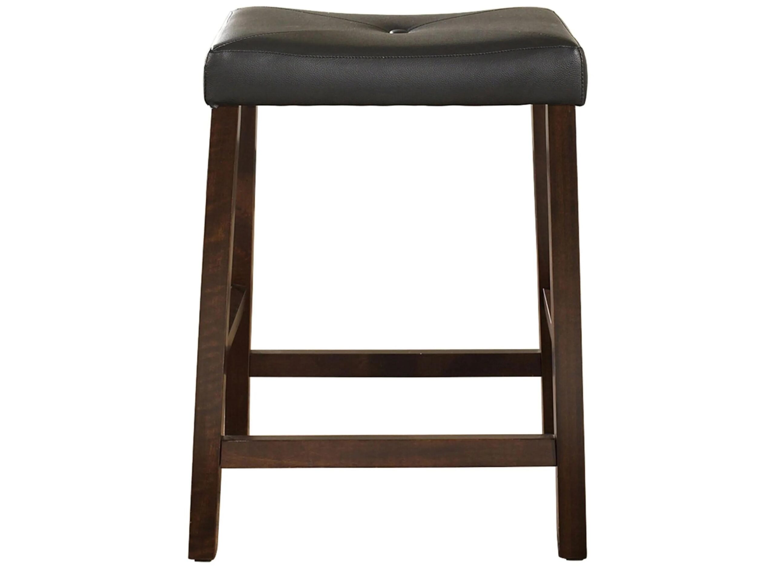 Simplicity and comfort are hallmarks of the Saddle Seat 2-pc. Counter Stool Set. The curved seat is upholstered in a durable yet stylish faux leather, making it resistant to spills and stains. With a seat height of 24 inches, the Saddle Seat 2-pc.