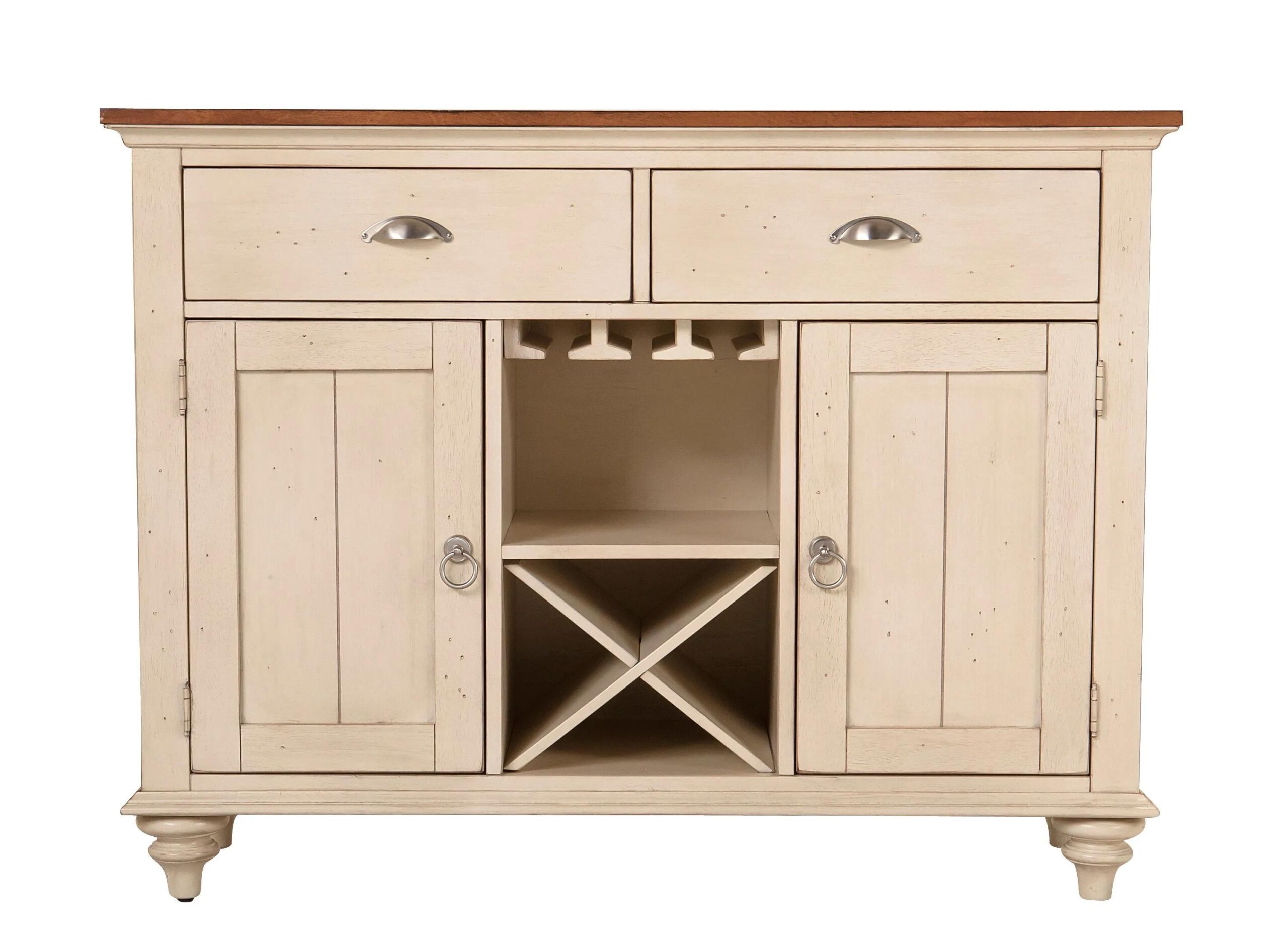If you love the look of timeworn furniture, you’re sure to appreciate this Sagamore buffet with wine storage. Its distressed bisque finish and distressed natural pine-finished top infuse the piece with casual beauty.