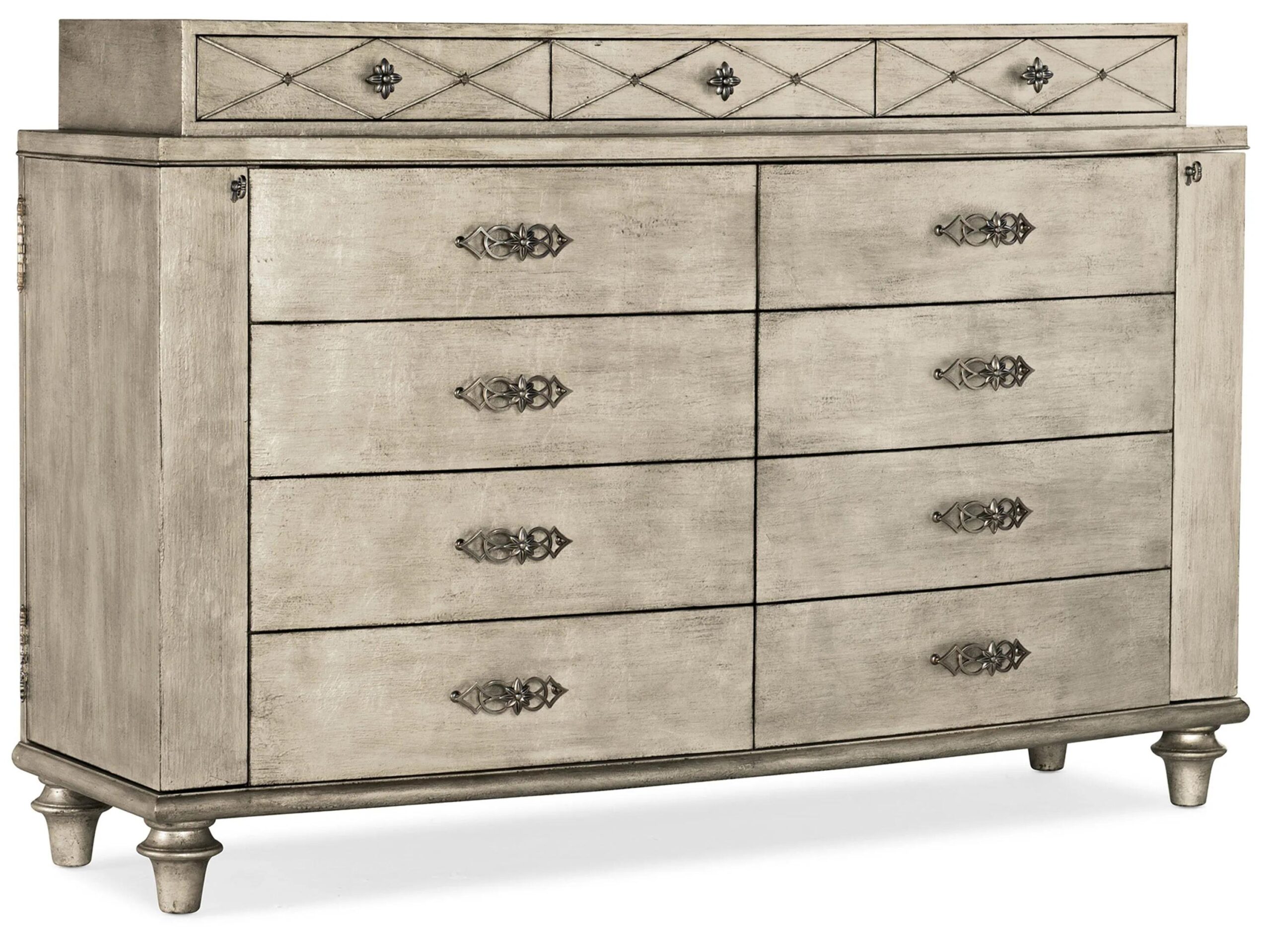 With a luxurious platinum patina, the Sanctuary Dresser is captivating and charming. Delightfully functional, there are jewelry doors on each end: doors with five jewelry hooks and 4 removable mesh jewelry bags attached to each door.