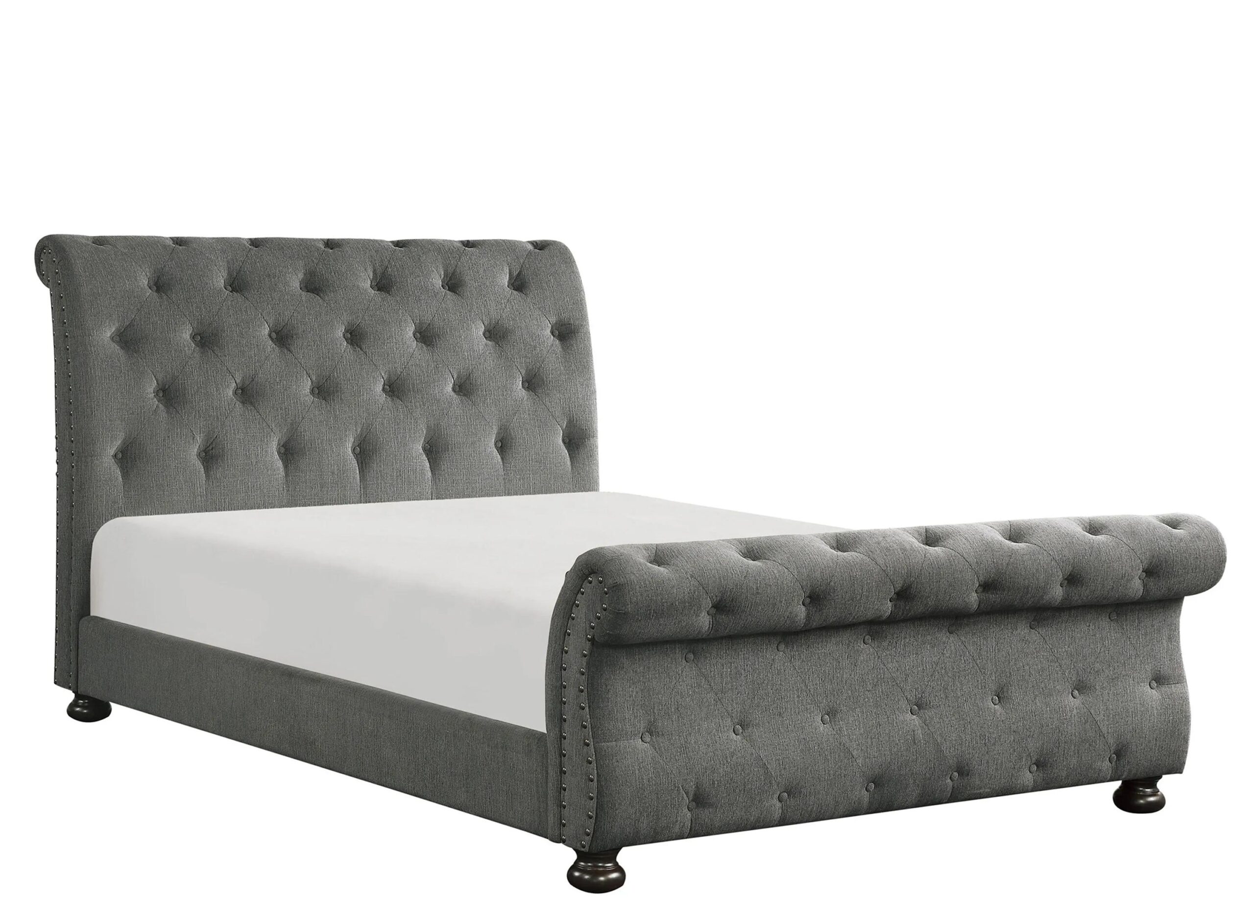The traditional styling of the Sanders California king upholstered bed serves as a classic addition to your home’s dcor. The gray covering of this fully upholstered sleigh bed is accented with button tufting, nail head accent and rolled profile, creating a neutral canvas for your decorative