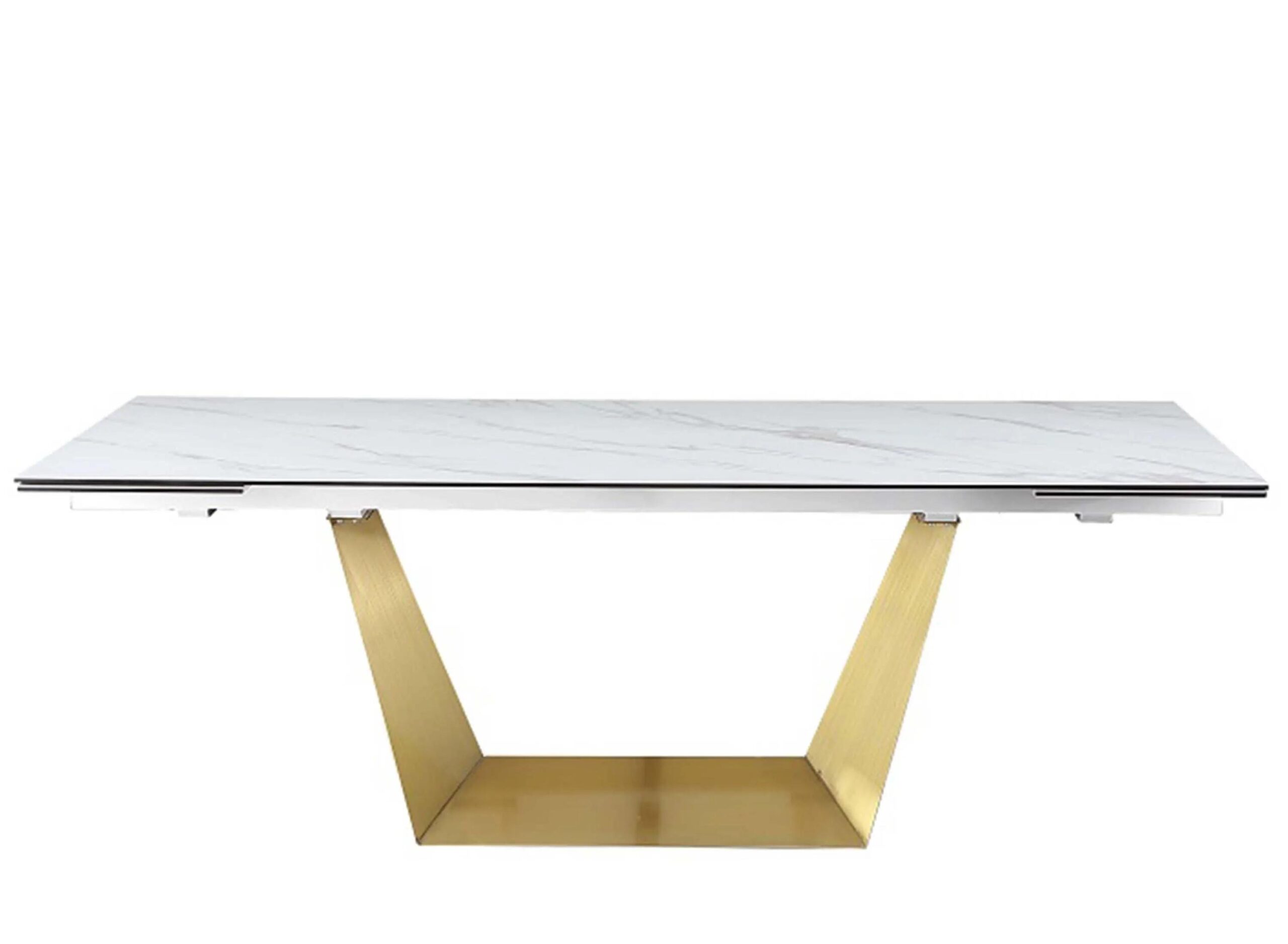 Featuring an extendable marbleized matte white ceramic top bonded to tempered glass with two 20″ smooth pull-out extensions, the Scarlette Dining Table rests neatly on a daring open frame art deco solid stainless-steel base in a warm brushed gold finish.