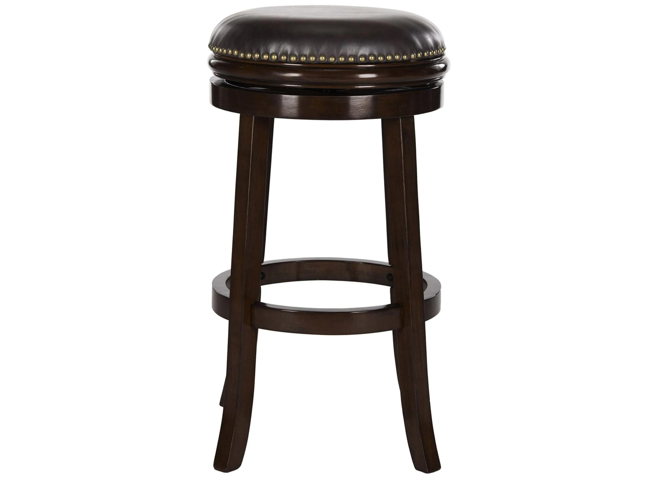 A transitional update of the classic British pub stool, the backless Seneca Swivel Bar Stool is crafted of eco friendly hardwood in sierra brown finish with dark brown PU leather and bronze nailhead trim.