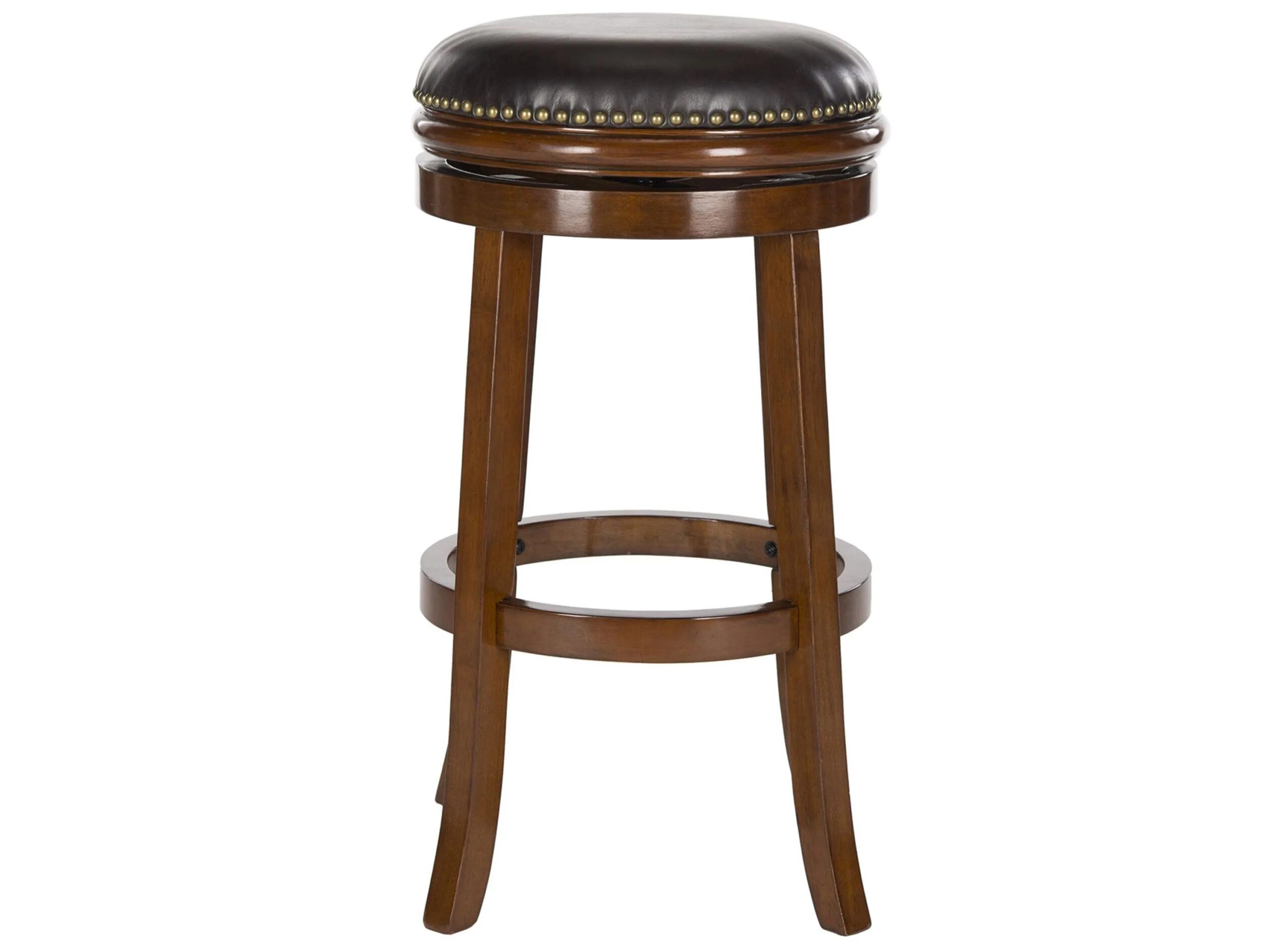 A transitional update of the classic British pub stool, the backless Seneca Swivel Bar Stool is crafted of eco friendly hardwood in a walnut finish and dark brown PU leather with bronze nailhead trim.