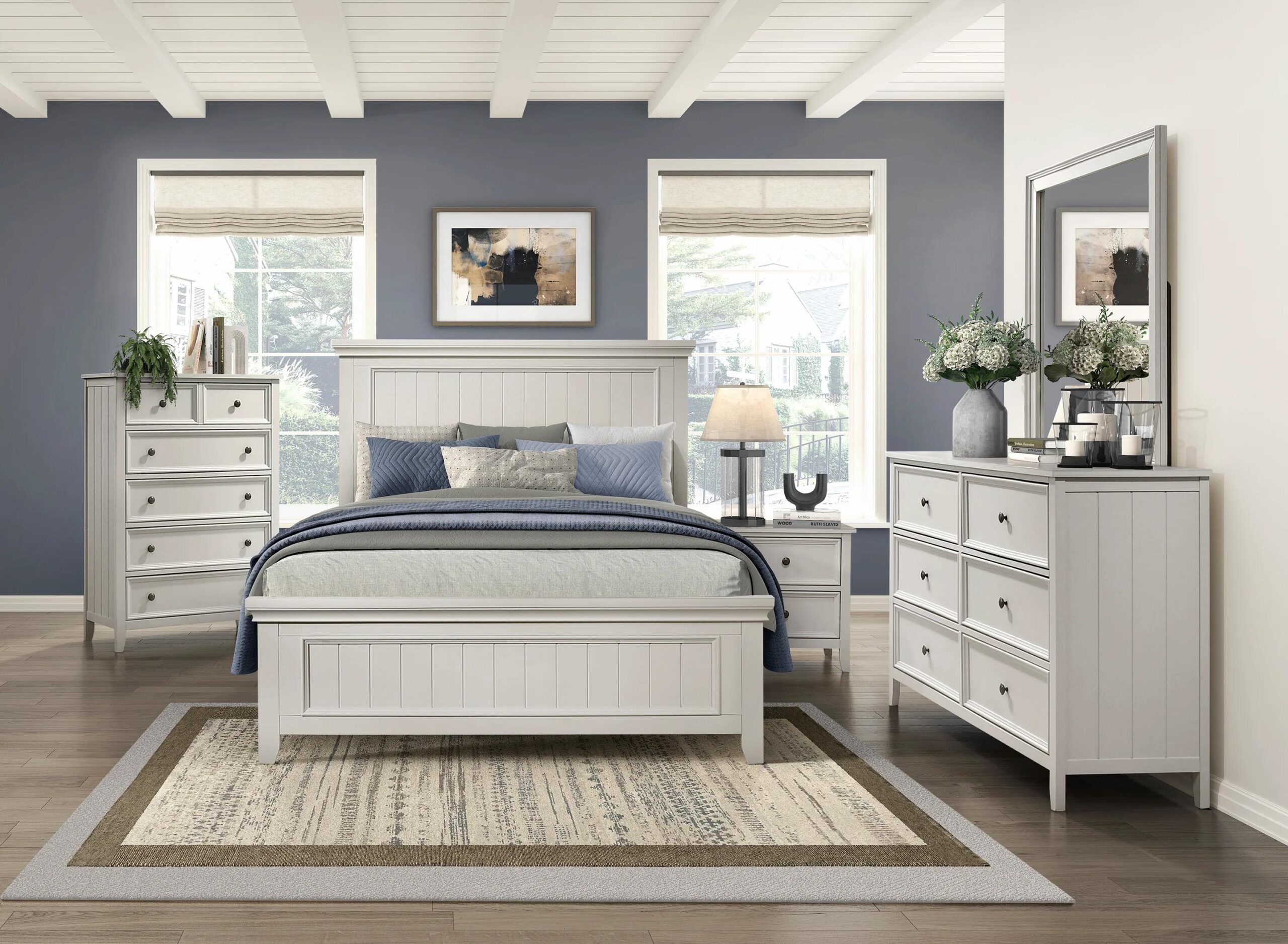 Hints of farmhouse living create the look of the Serena 4pc. Bedroom Set. The white finish of the collection is a subtle canvas for your bedroom’s decor. Framed shiplap-inspired panels lend a classic decorative accent to each piece in the collection.