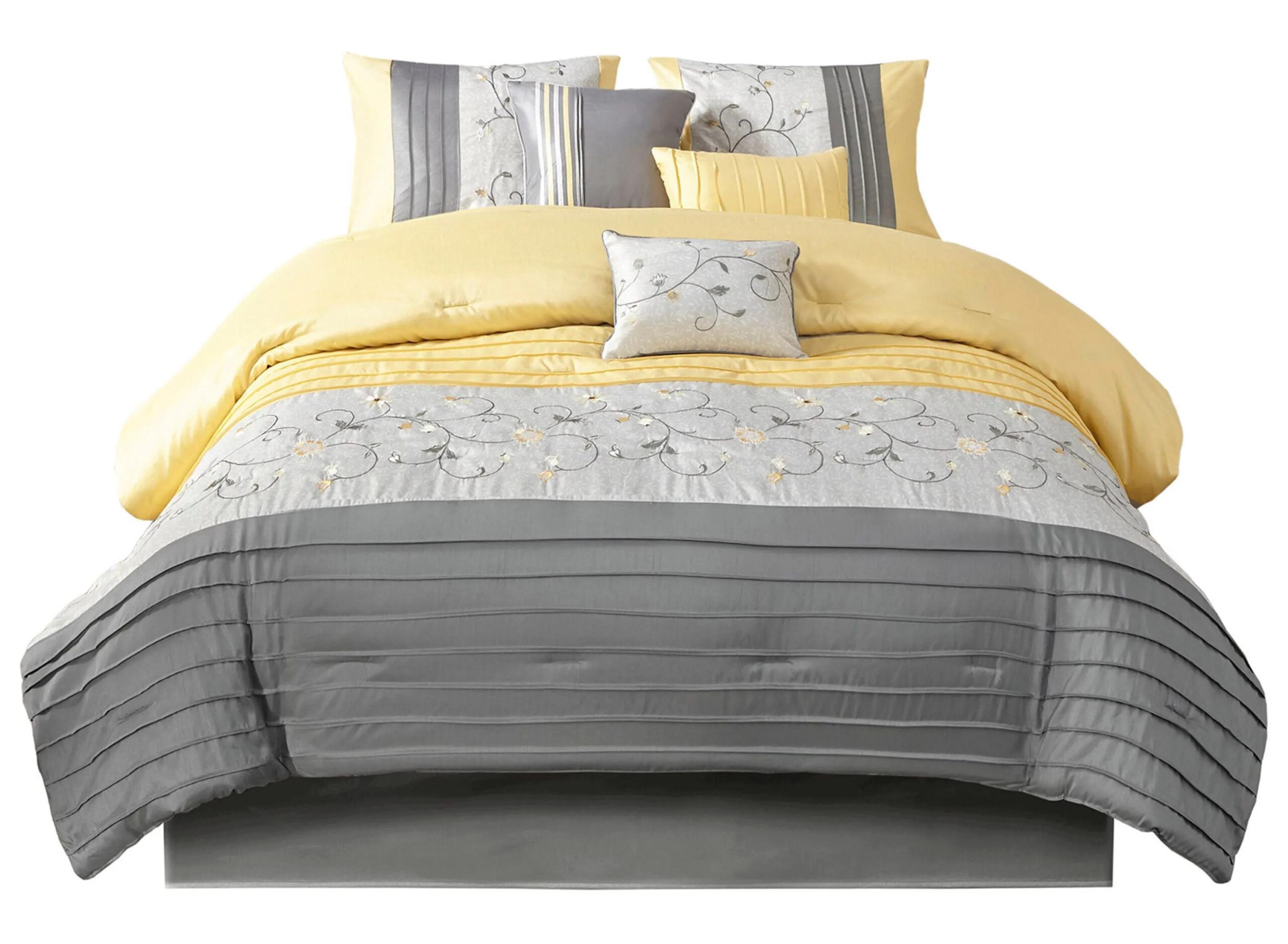 Elegantly update your bedroom with the Serene California king 7-piece comforter set. A beautifully embroidered floral pattern is showcased on the faux silk comforter. The pieced design, in yellow and gray hues, adds a lovely contrast and texture to the ensemble.