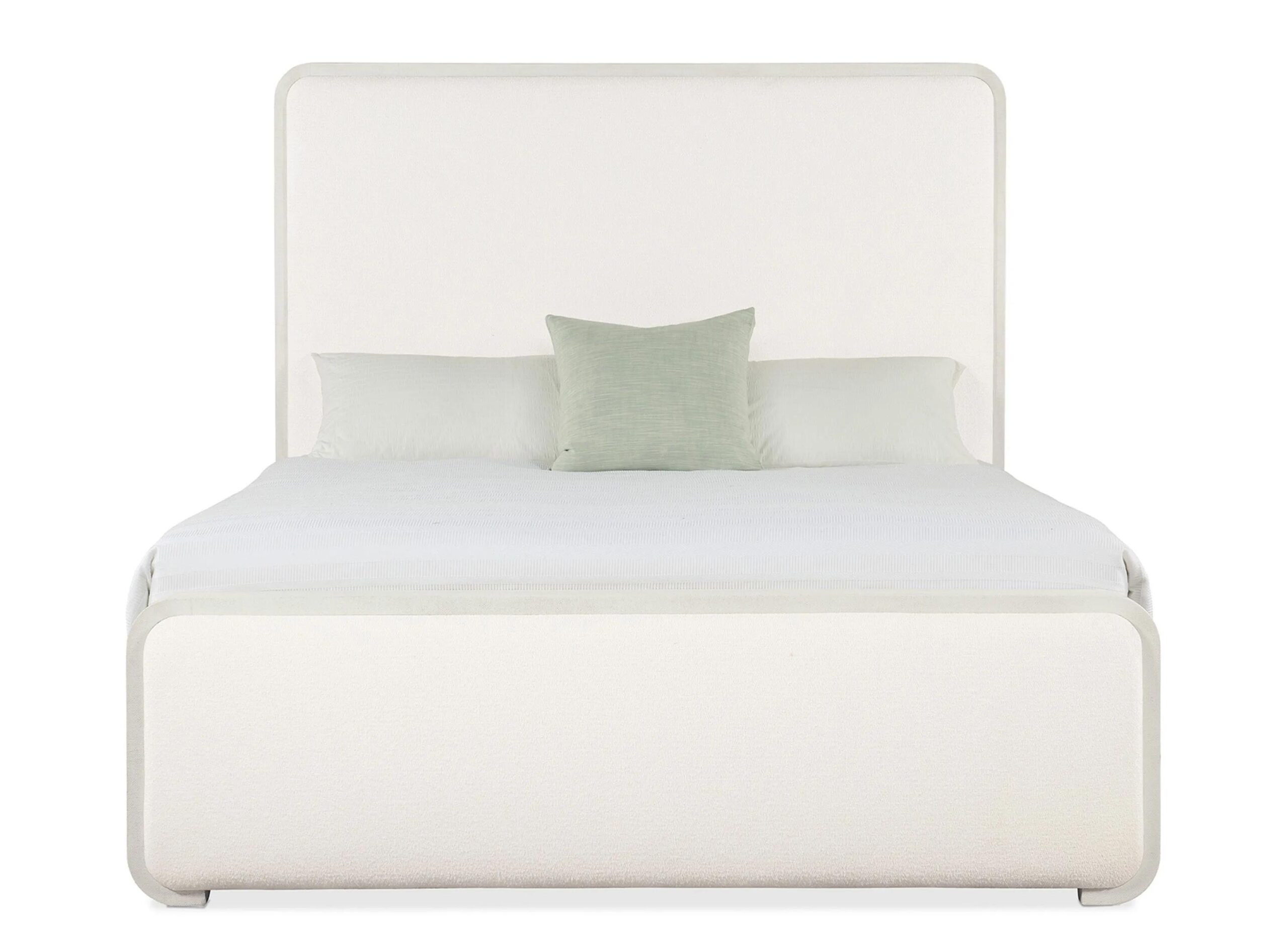 Create a tranquil bedroom retreat in a soft creamy white palette and soft silhouette with the Serenity Upholstered King Panel Bed. This striking bed combines the artic performance fabric on the upholstered headboard with the sand dollar white lacquered glasscloth.