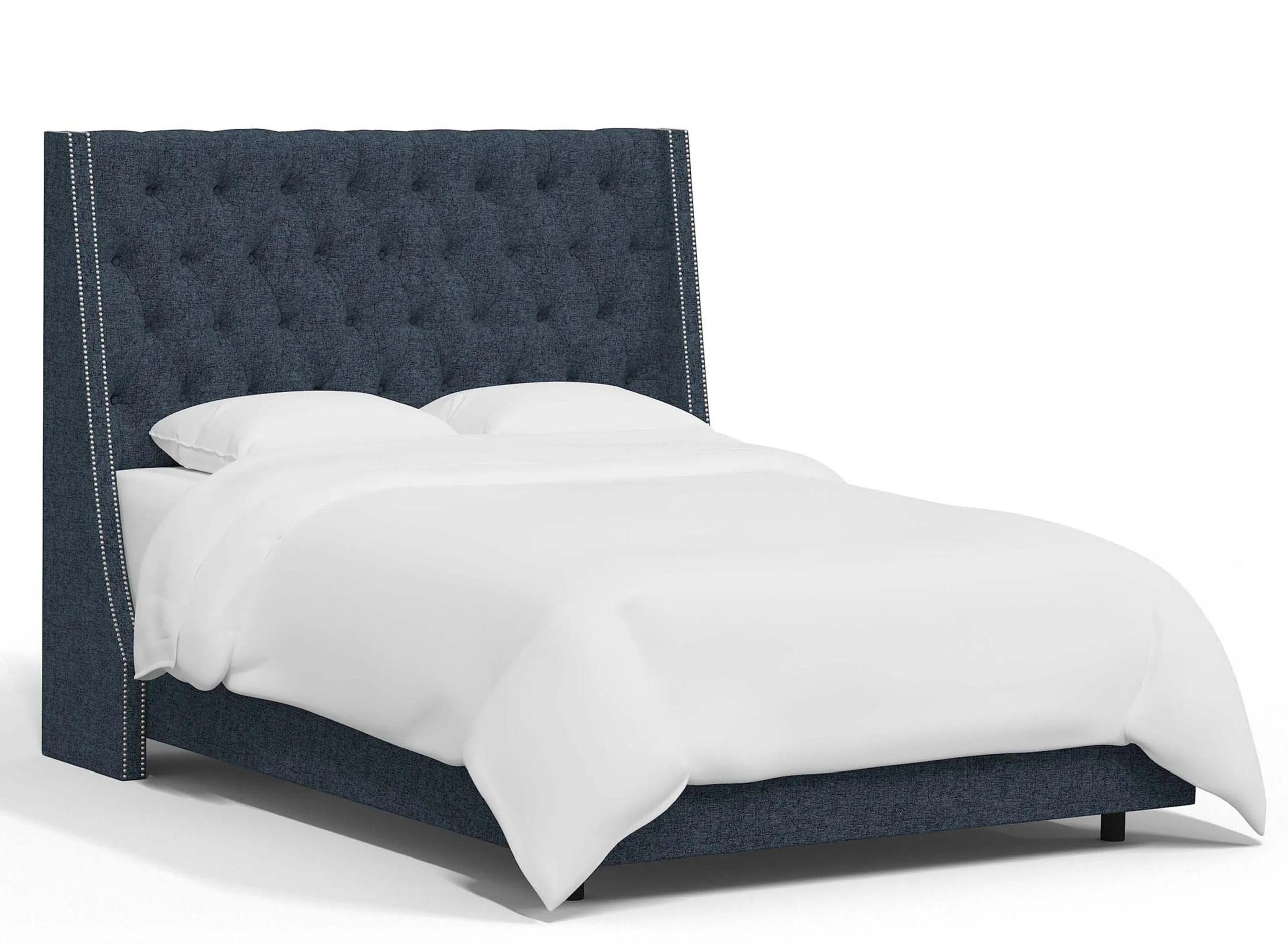 This custom-made Sheridan tufted wingback bed is fully upholstered and manufactured in Illinois. The graceful design is tastefully accented with a lovely nail button detail that is both trendy and traditional.