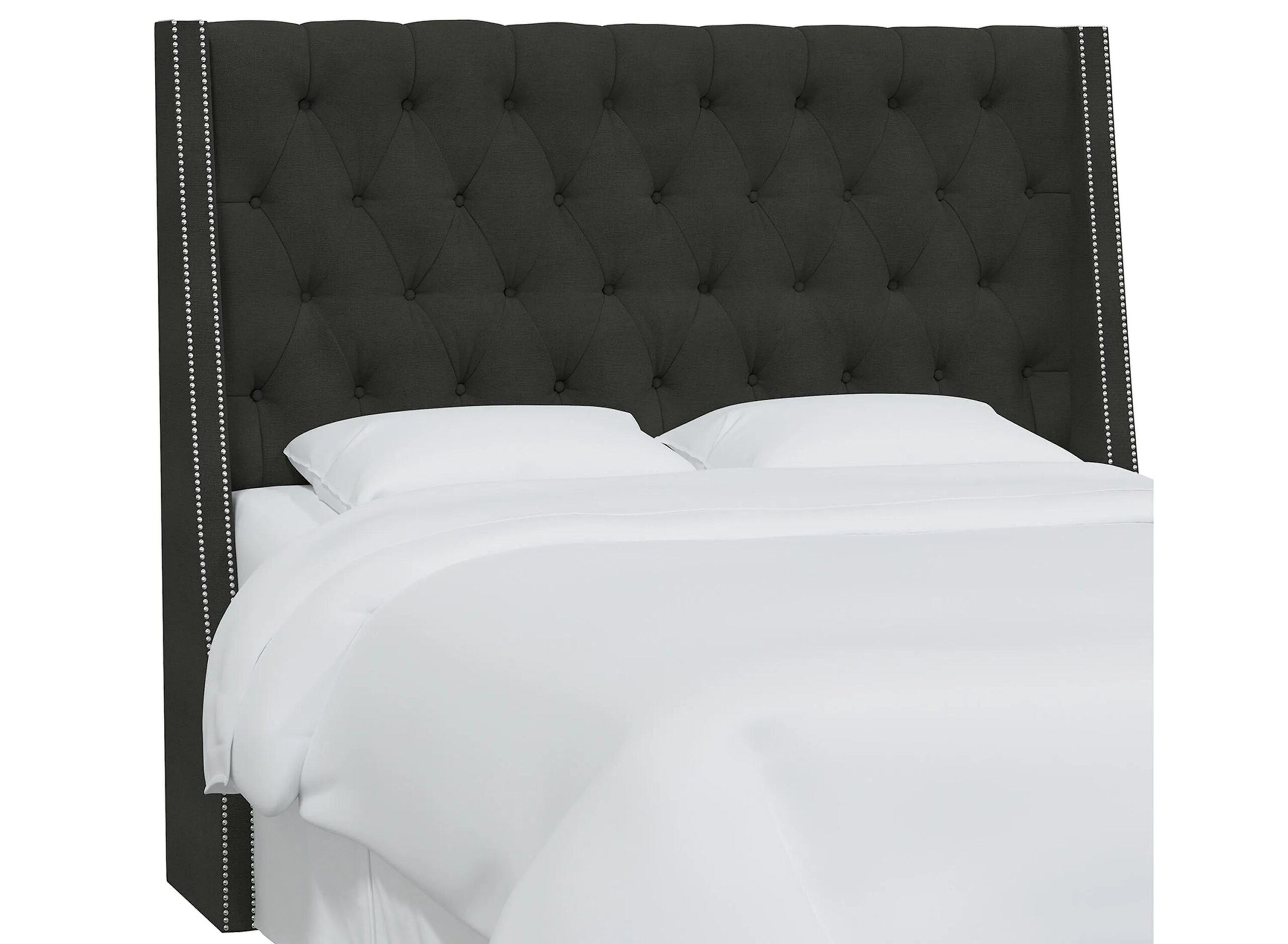 This custom-made Sheridan tufted wingback headboard is fully upholstered, manufactured in Illinois, and attaches easily to any standard bed frame. The graceful design is tastefully accented with a lovely nail button detail that is both trendy-and traditional.