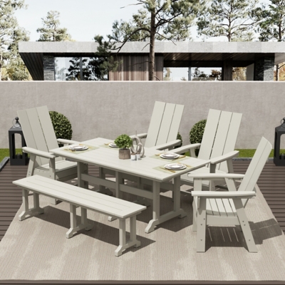 Make your outdoor space more welcoming with this 6-piece simple patio dining set. Made from HDPE, this set is constructed with simple lines. The four comfortable dining chairs and bench feature a clean-line design for a fun and modern spin on the classic outdoor dining set.