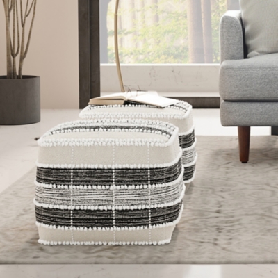 The Barley Square Woven Outdoor/ Indoor Pouf brings style and comfort to your inside or outdoor space. This pouf boasts durable and easy-care woven polyester in a striped design that is water and UV resistant.