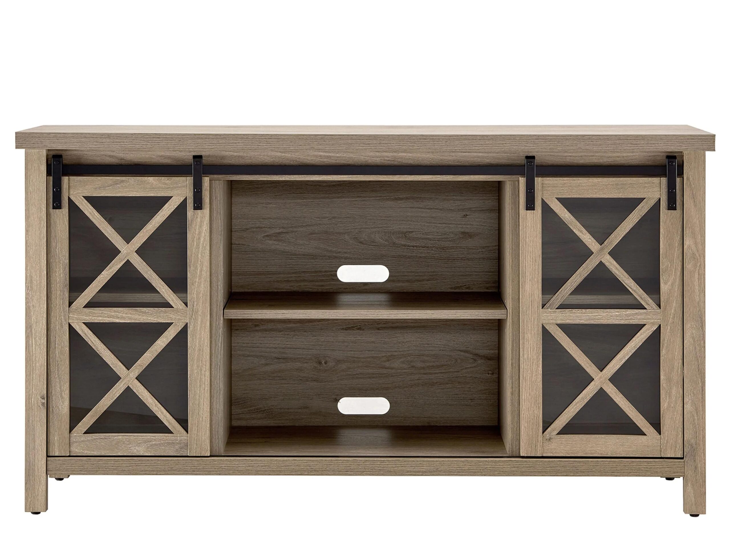 Combine functionality and on-trend design with this sturdy Smith TV Stand. Its rich wood tone creates a warm neutral palette that will blend seamlessly into any color scheme, while its functional sliding barn doors add a touch of modern farmhouse whimsy.