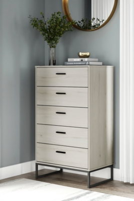 Light and bright, this chest of drawers is inspired by chic design. A light natural finish over replicated oak grain offers an authentic touch to this so-cool piece. It beautifully blends the hues of natural living with the edginess of your modern lifestyle.