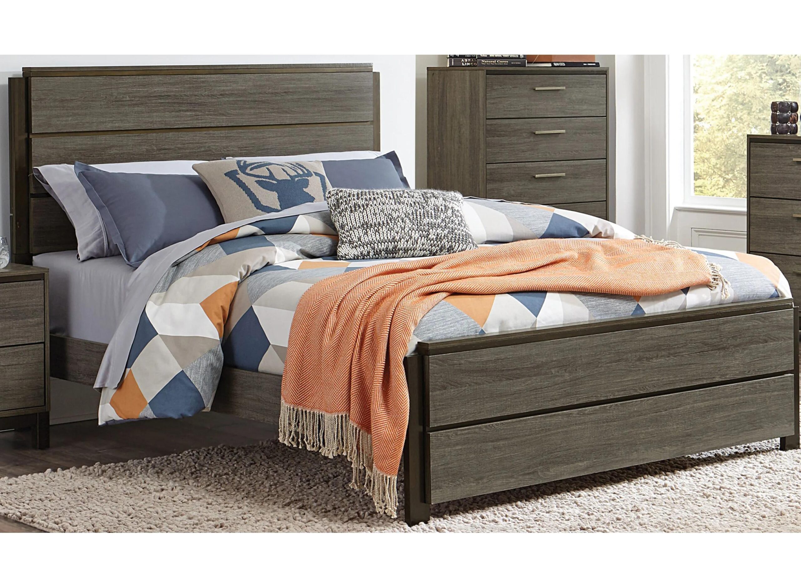 The contemporary styling of the Solace California king bed provides a unique platform from which to redecorate your bedroom. The gray finish is in perfect contrast to the dark brown base rails and back panels of the headboard.