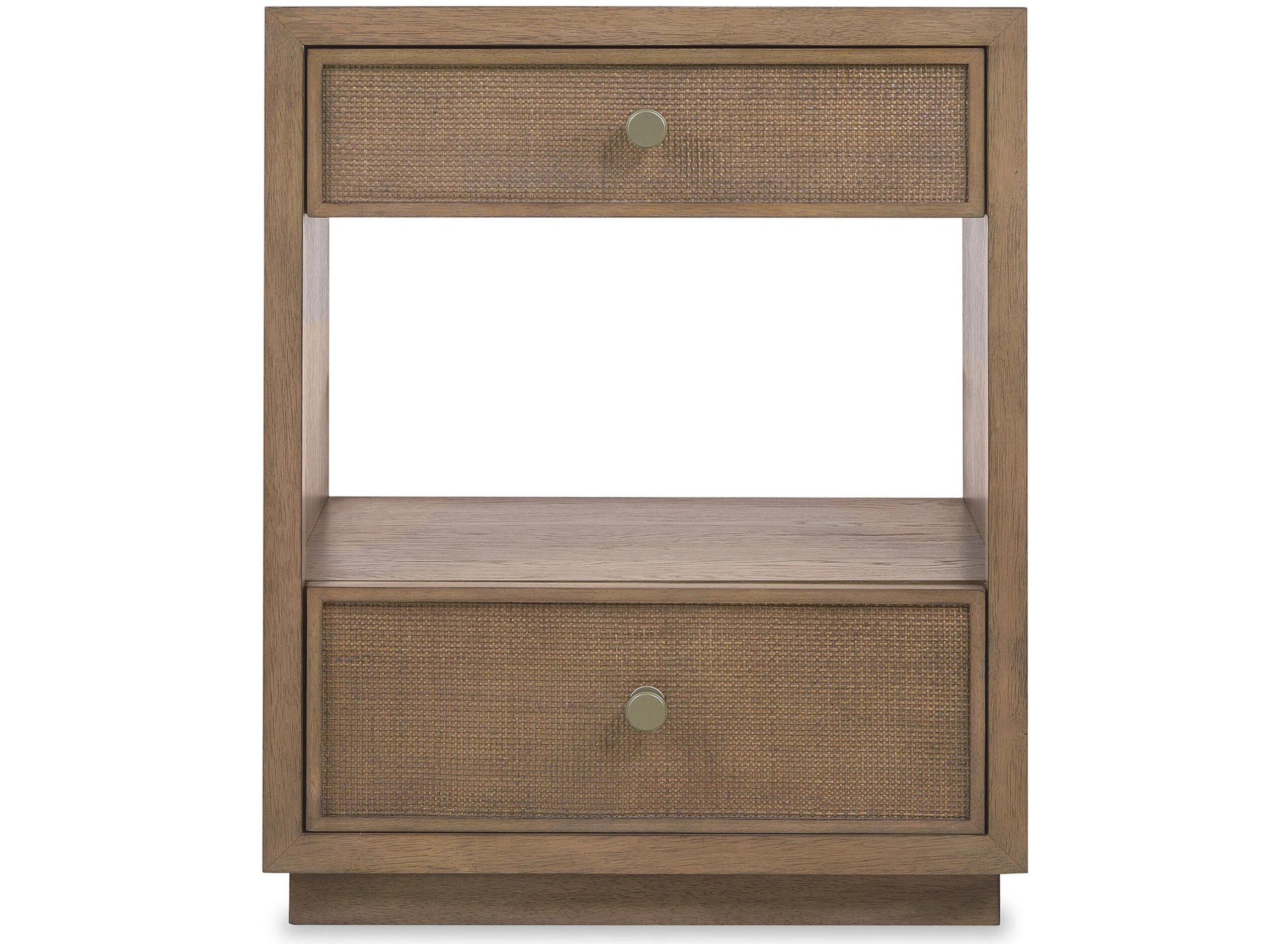A stylistically versatile nightstand blending natural textures with a light-and-airy modern aesthetic, the Sonnet Two Drawer Nightstand has two self-closing drawers with cane fronts. Crafted of quartered and cathedral-cut white oak veneers in a light earthen-toned finish, it has an open space abo