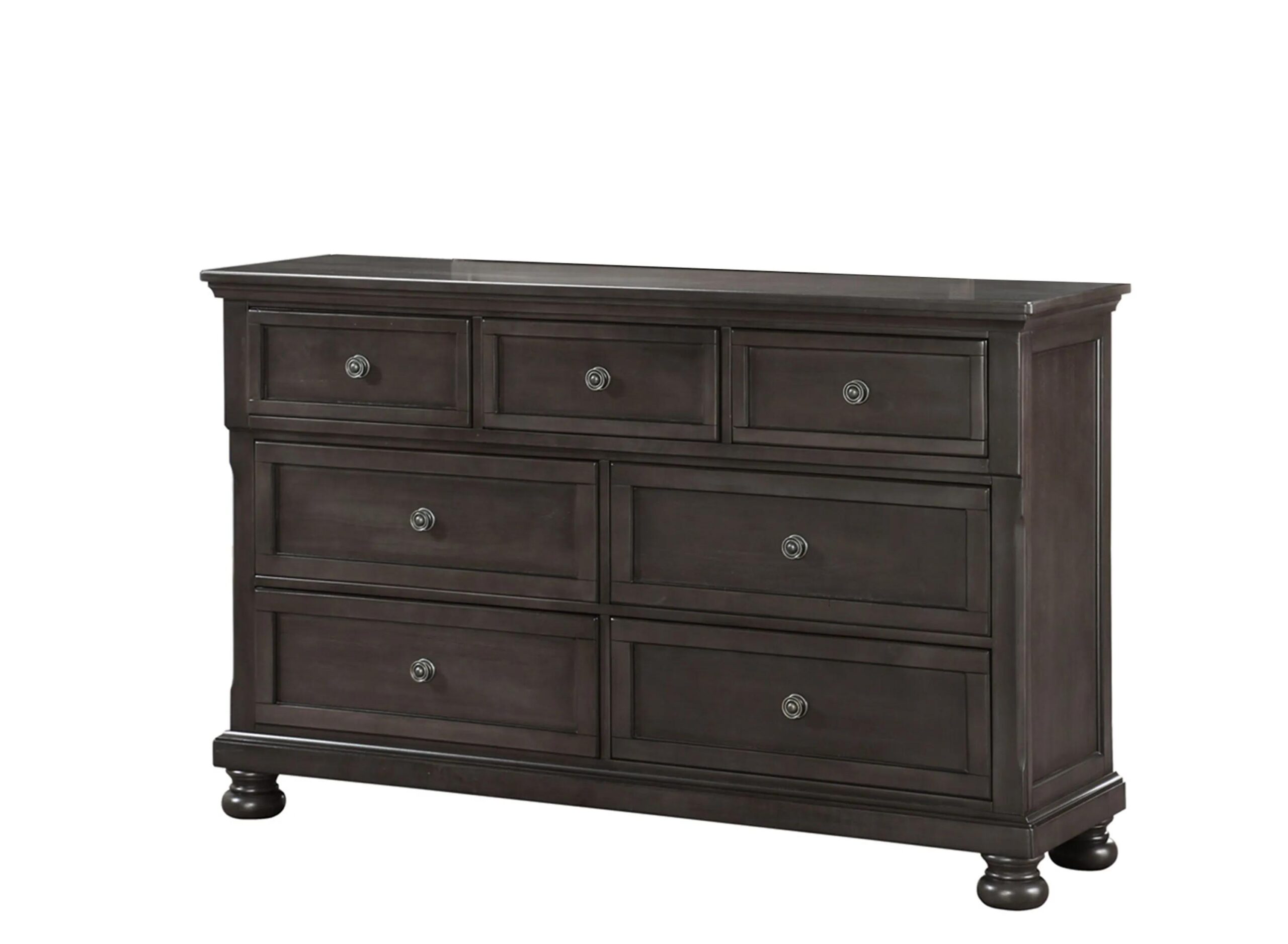 The traditional clean simple lines of Soriah bedroom dresser create a setting sure to please. Supported by sturdy bun feet and accentuated by upper drawer notched-out fronts, while antique pewter hardware knobs provide access inside doors.