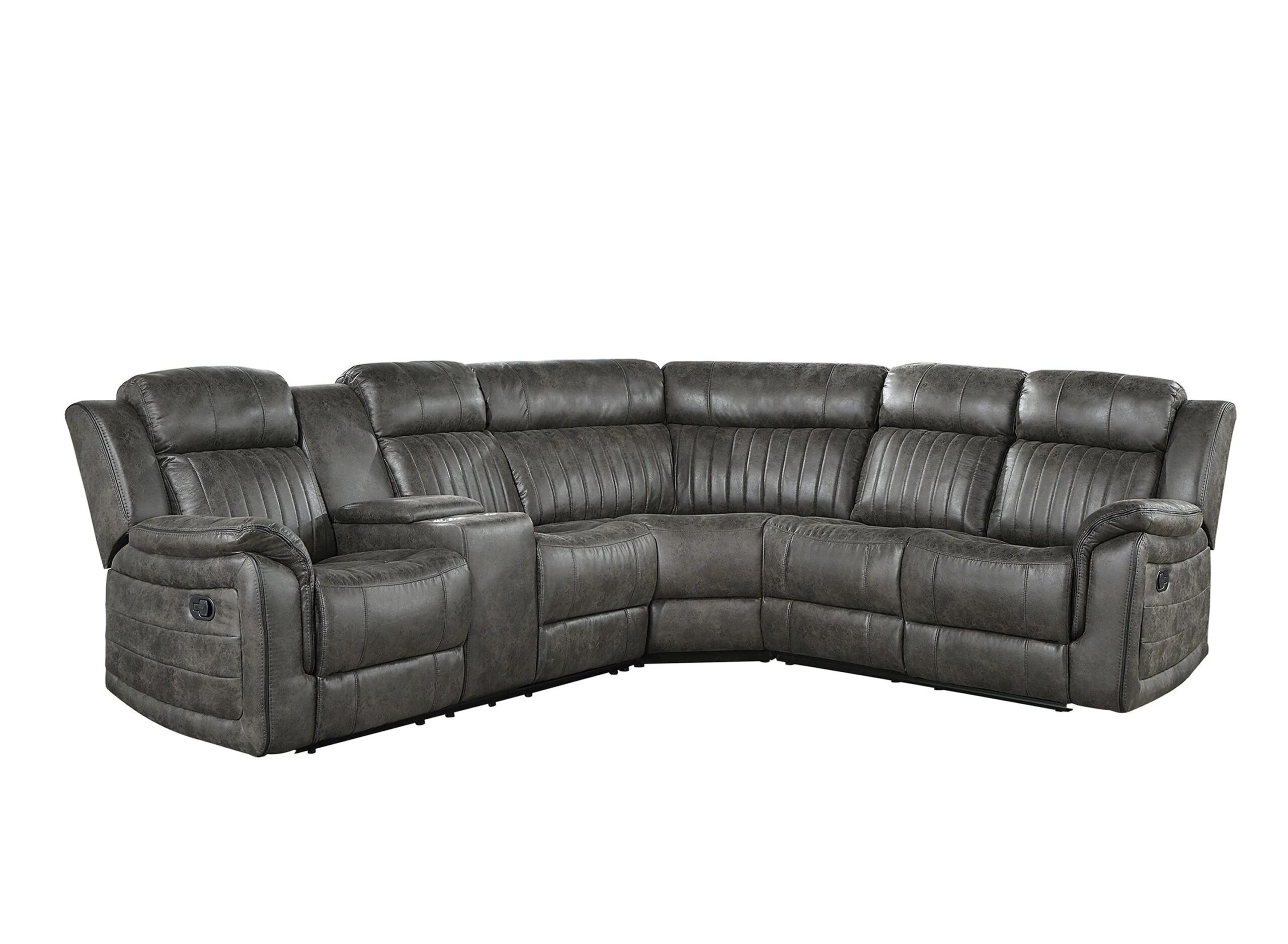 The design of the Spivey 3-pc. reclining sectional provides a platform for your relaxing downtime. From the classic transitional style to the versatile neutral color of the brown-ish gray faux suede fabric covering, this collection is the perfect addition to your living room.