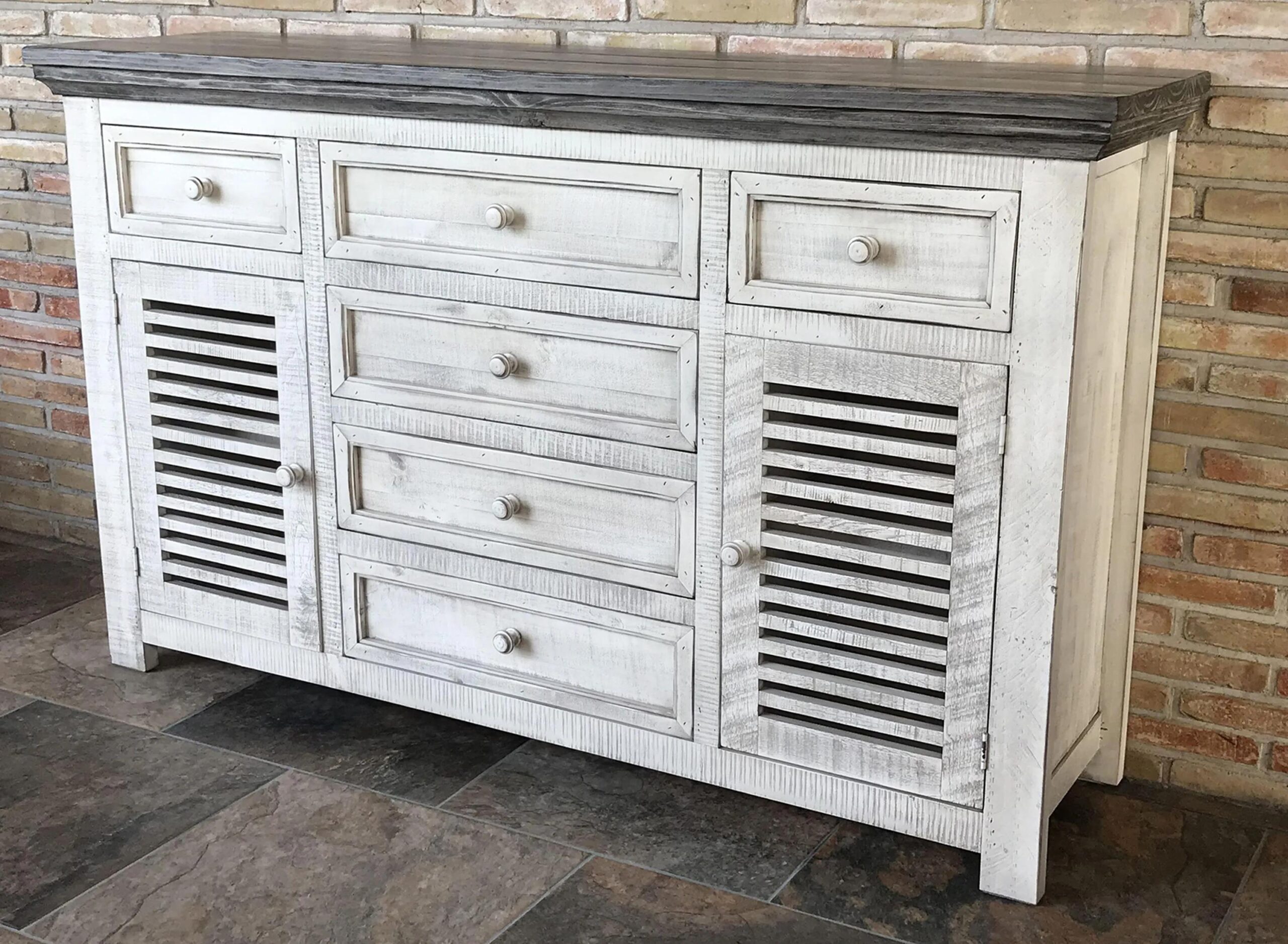 Being more than just a dining room focal point, the Stone Buffet offers you 6 drawers to store any items you don’t want on display. Two laddered doors add subtle detail while being functional enough to keep your seasonal linens organized and out of sight.