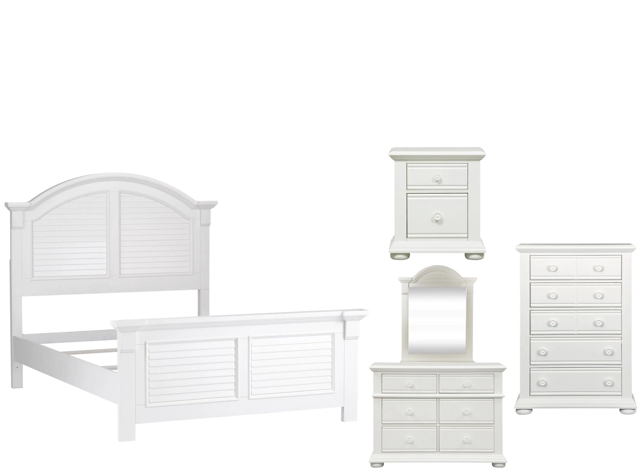 The cottage design of the Summer House 4-pc. Bedroom Set with 5 Drawer Chest is always in fashion. Summer House features the best of the cottage style with louvered panel accents in a stunning oyster white finish.