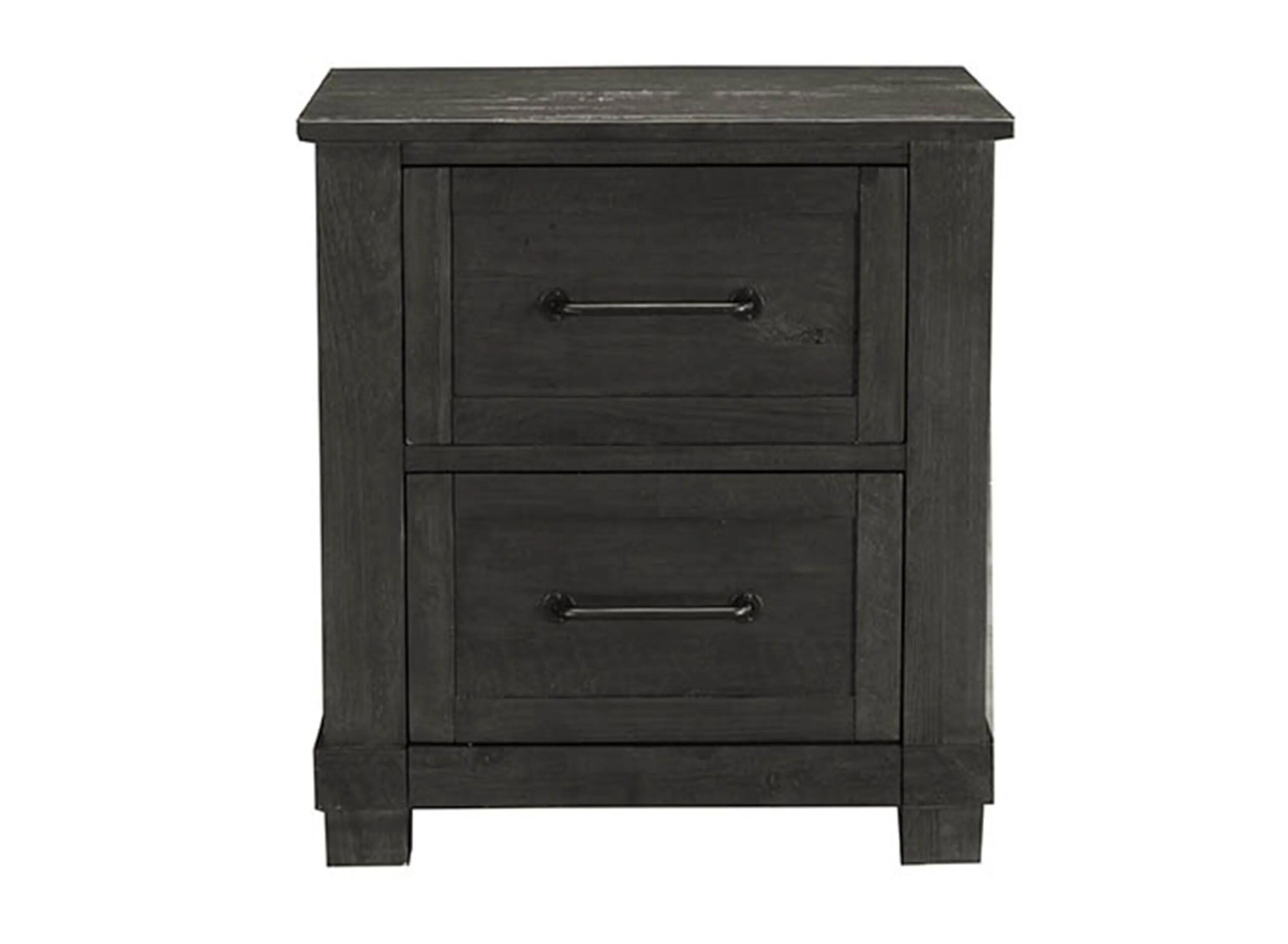 Our Sun Valley Nightstand evokes the rustic style of early America with a distinct charcoal finish that highlights the natural character of the solid pine. Each dresser is accented with industrial handles and provides ample drawer door storage.