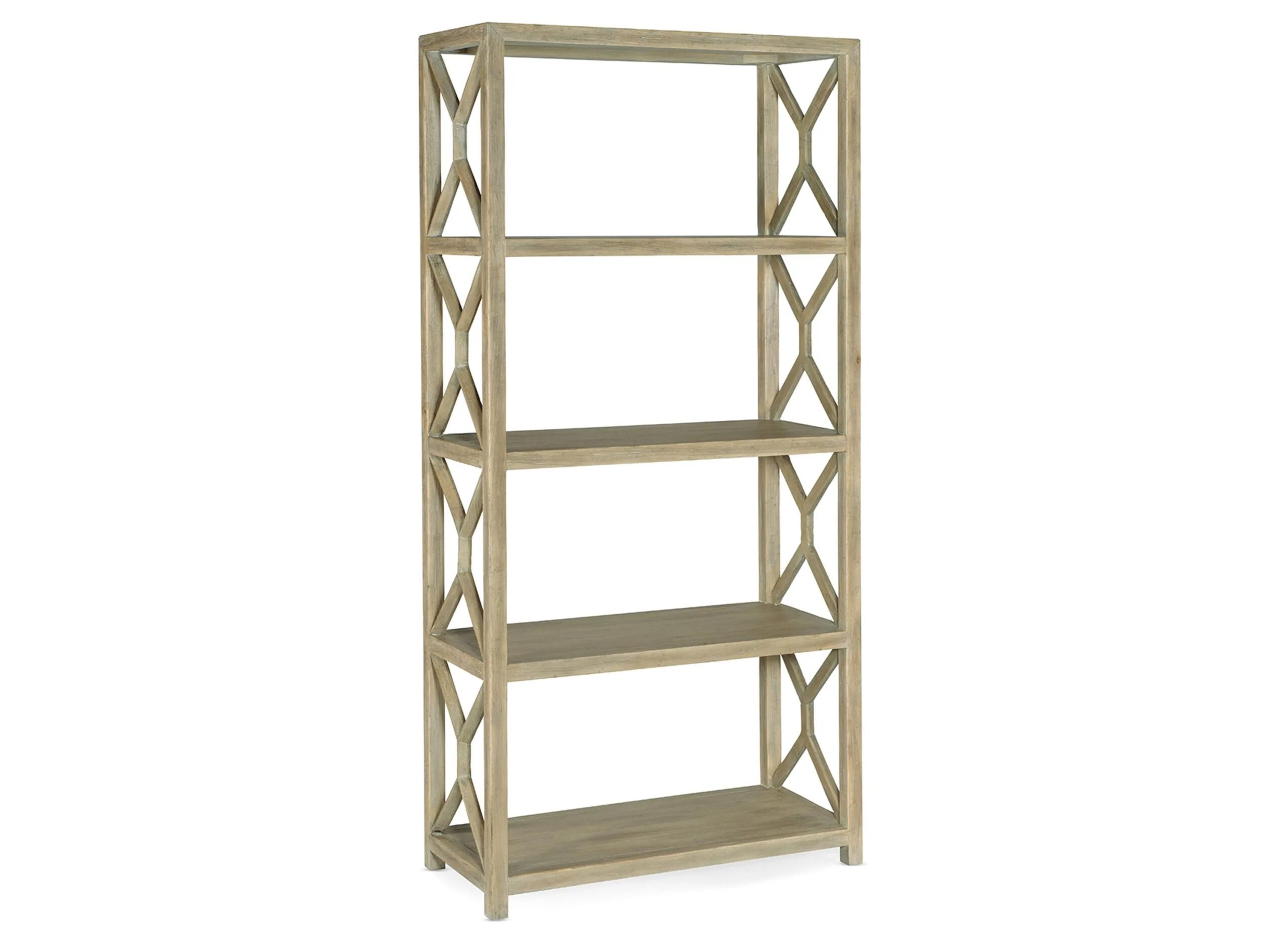 Create a resort-inspired retreat with the Surfrider Bookcase, featuring a wood frame crafted of Pecan Veneers finished in the light natural Driftwood finish. The laid-back vibe of this California casual-inspired piece is enhanced by geometric fretwork on the sides of the four fixed shelves.