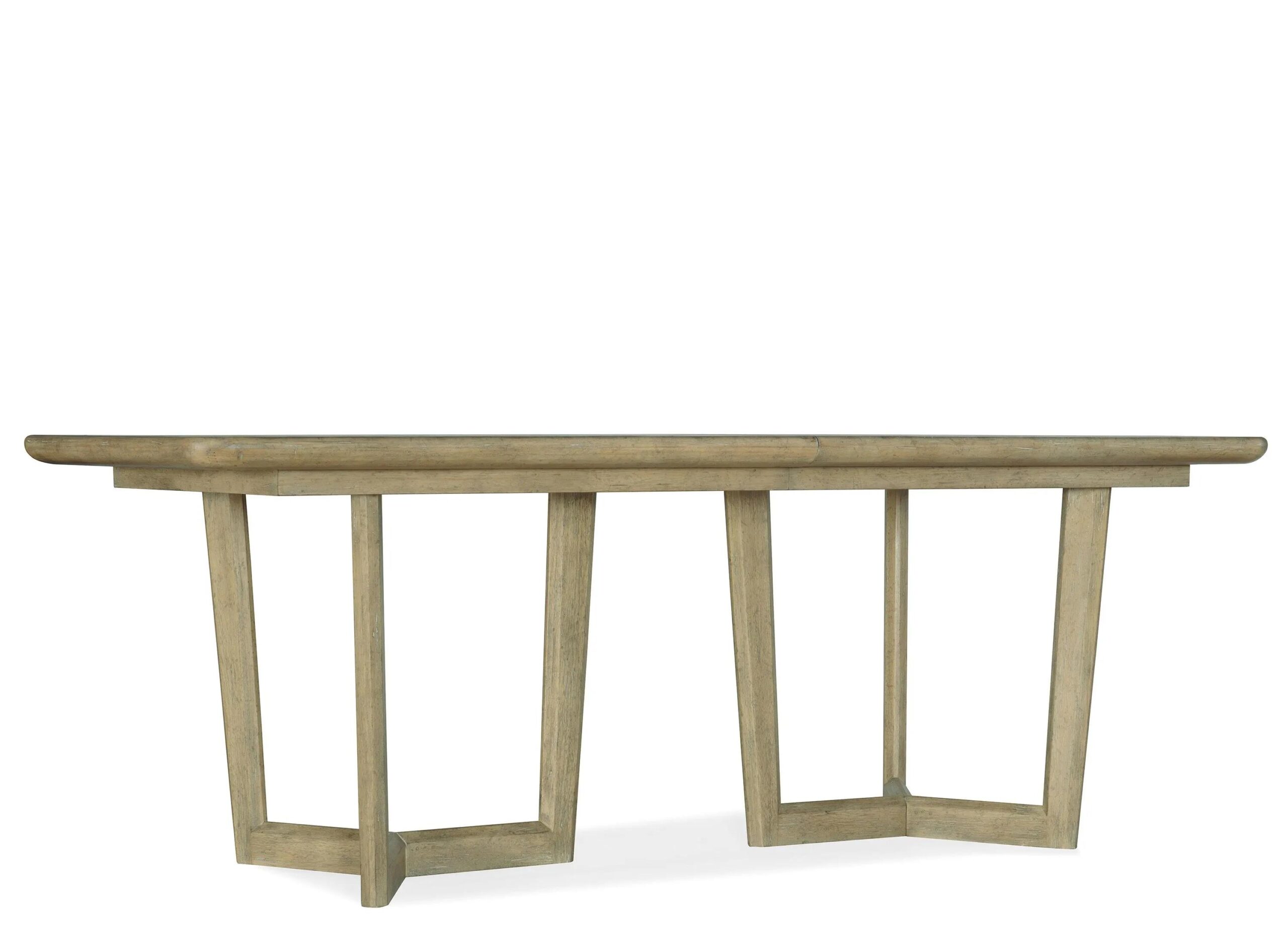 Inspired by the laid-back California coast, the Surfrider Rectangular Dining Table combines a Solid Wood-edge top crafted of Pecan Veneers with an airy double base. Finished in the light natural Driftwood finish, the table offers two 18-inch leaves, extending the table to 118 inches, accommodatin
