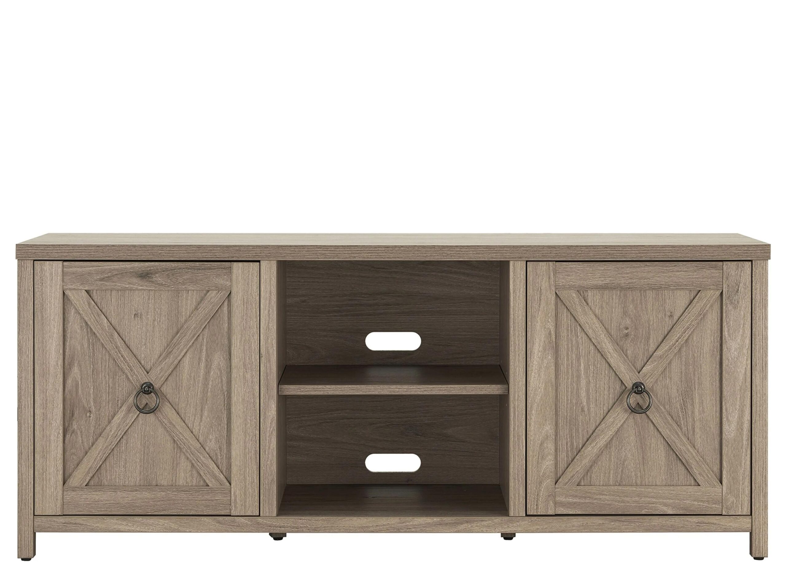 Combine functionality and classic modern farmhouse design with this sturdy Taylor TV Stand. Its rich wood tone creates a warm neutral palette that will blend seamlessly into any color scheme, while its side cabinets allow for plenty of hidden storage.