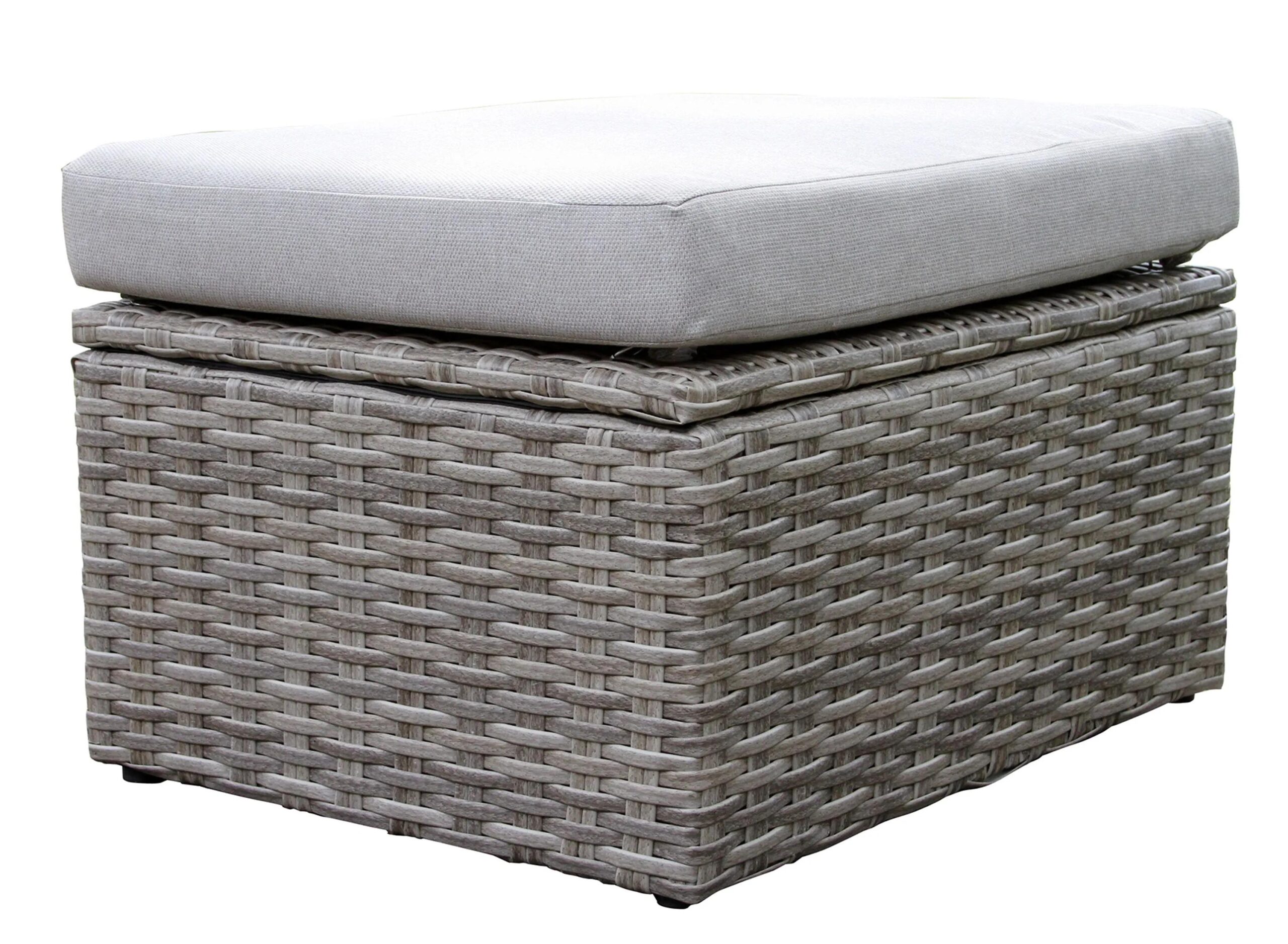 Optimize your seating group with the functional Teak and Wicker Storage Ottoman. This footstool is made with HDPE all-weather wicker handwoven around powder-coated aluminum frames. The stool opens up to provide waterproof storage for the cushion.