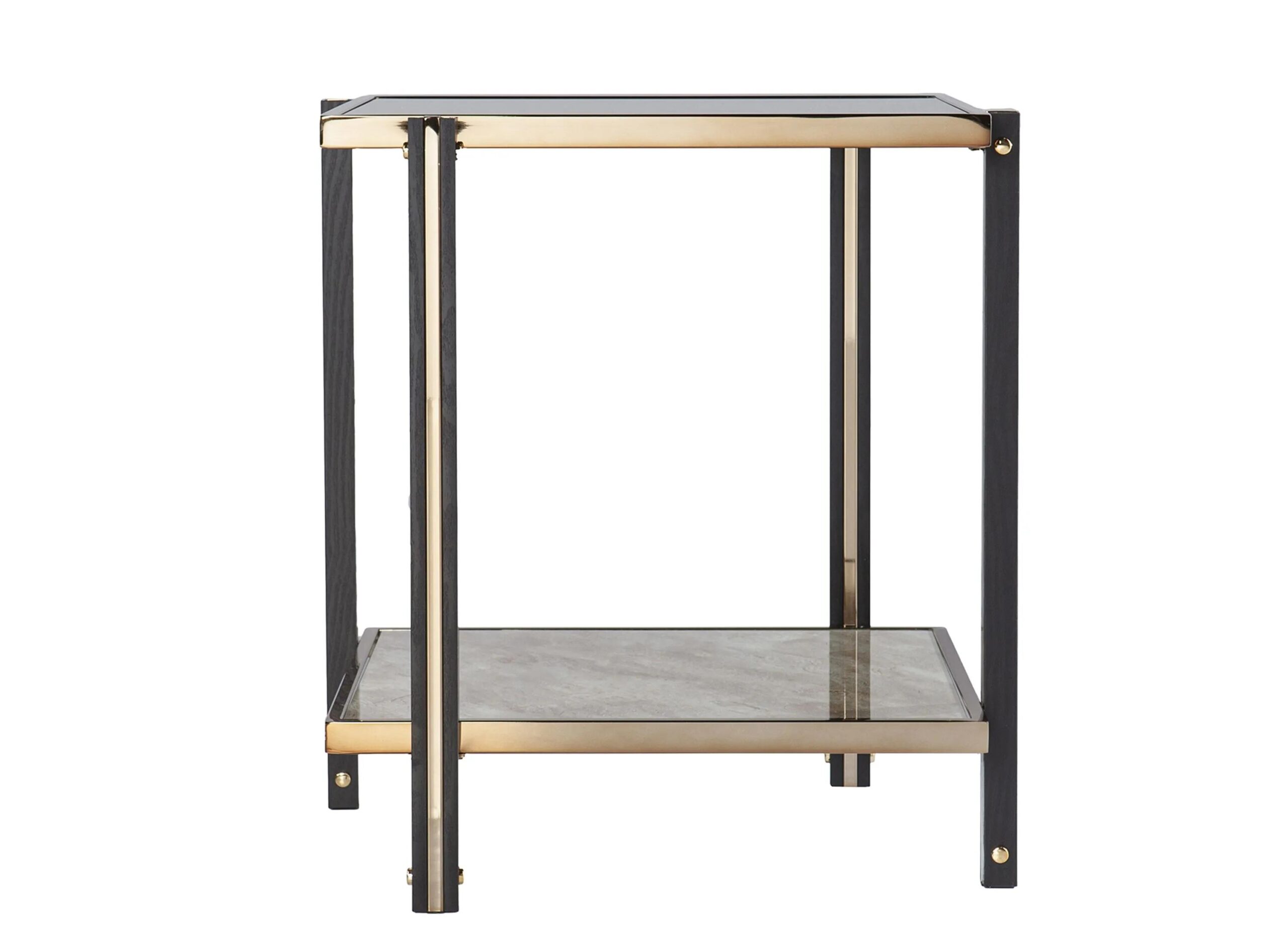 Thornsett End Table reflect on your good taste with this mirrored end table. The glass tabletop offers space for a lamp and a cup of java, while the lower shelf keeps books and magazines tidy. A champagne-hued frame wraps around the smoky mirrored tabletop, crafting an elegant design alongside yo