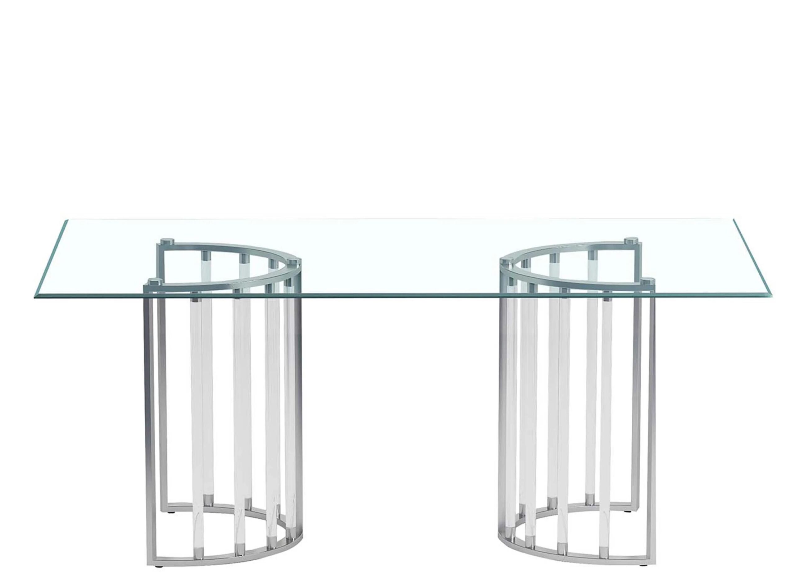 Trisha Glass Dining Table is sure to take your dining area to the next level. Set atop two semi -circle base pieces, the steel and acrylic features will add a polish you’re sure to appreciate.