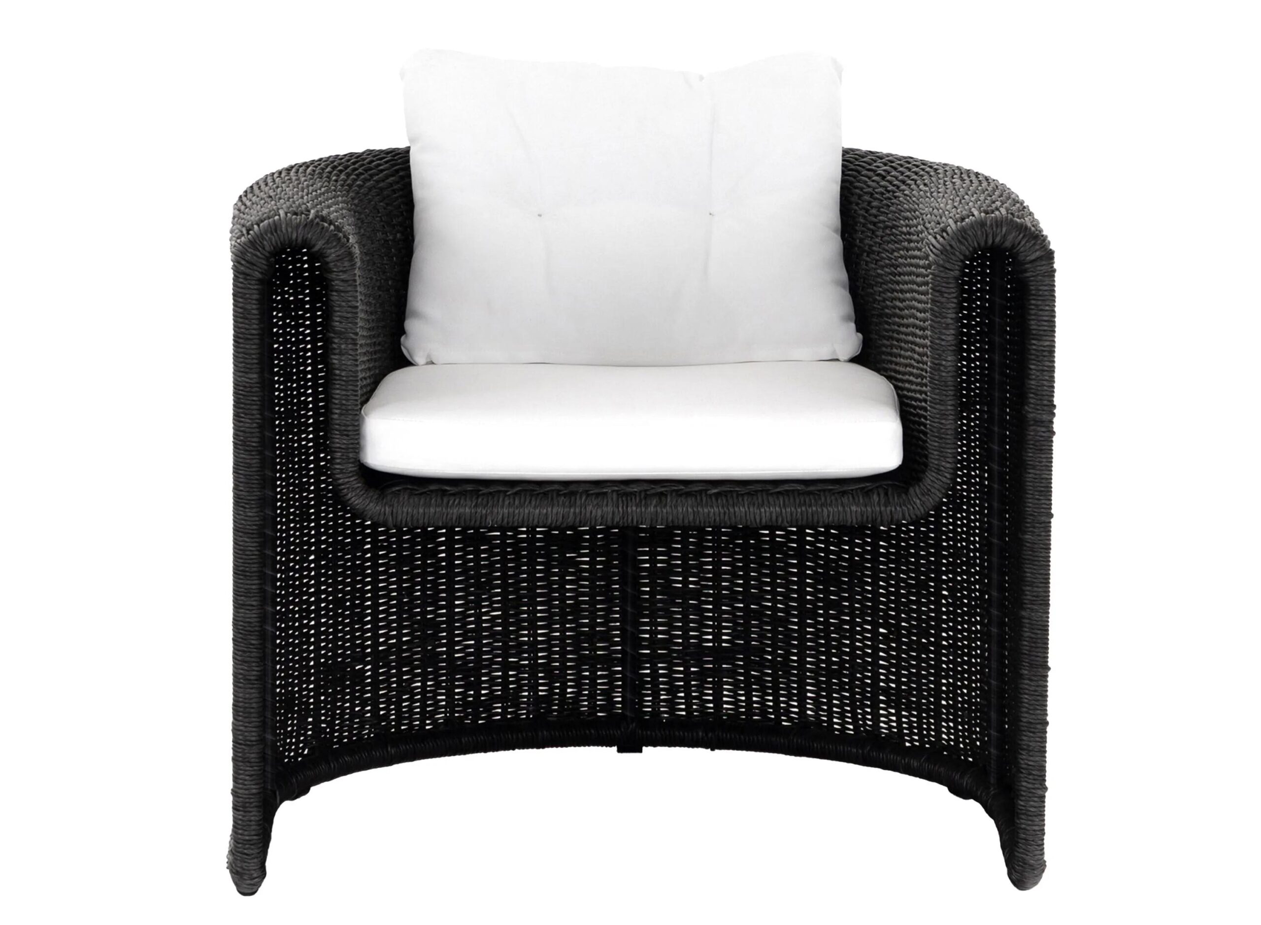 A nod to curvy Seventies styling, wicker framing forms a fluid sling-like shape with a waterfall arm and features durable tufted cushioning in this Tucson Woven Outdoor Chair. Cover or store indoors during inclement weather and when not in use.