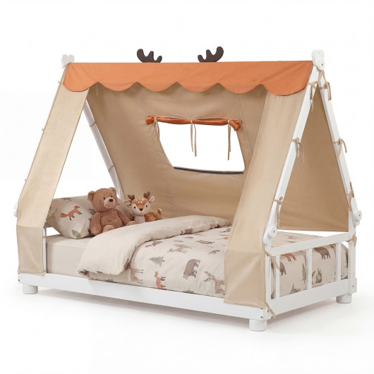 ● Plush Dutch velvet fabric tent creates a cozy and warm sleep space● Canopy tent with fixing ties is removable and washable● Antler themed house frame for a whimsical look● Allow you to personalize the interior space with different decorations (not included)● Roll-up curtain opens the