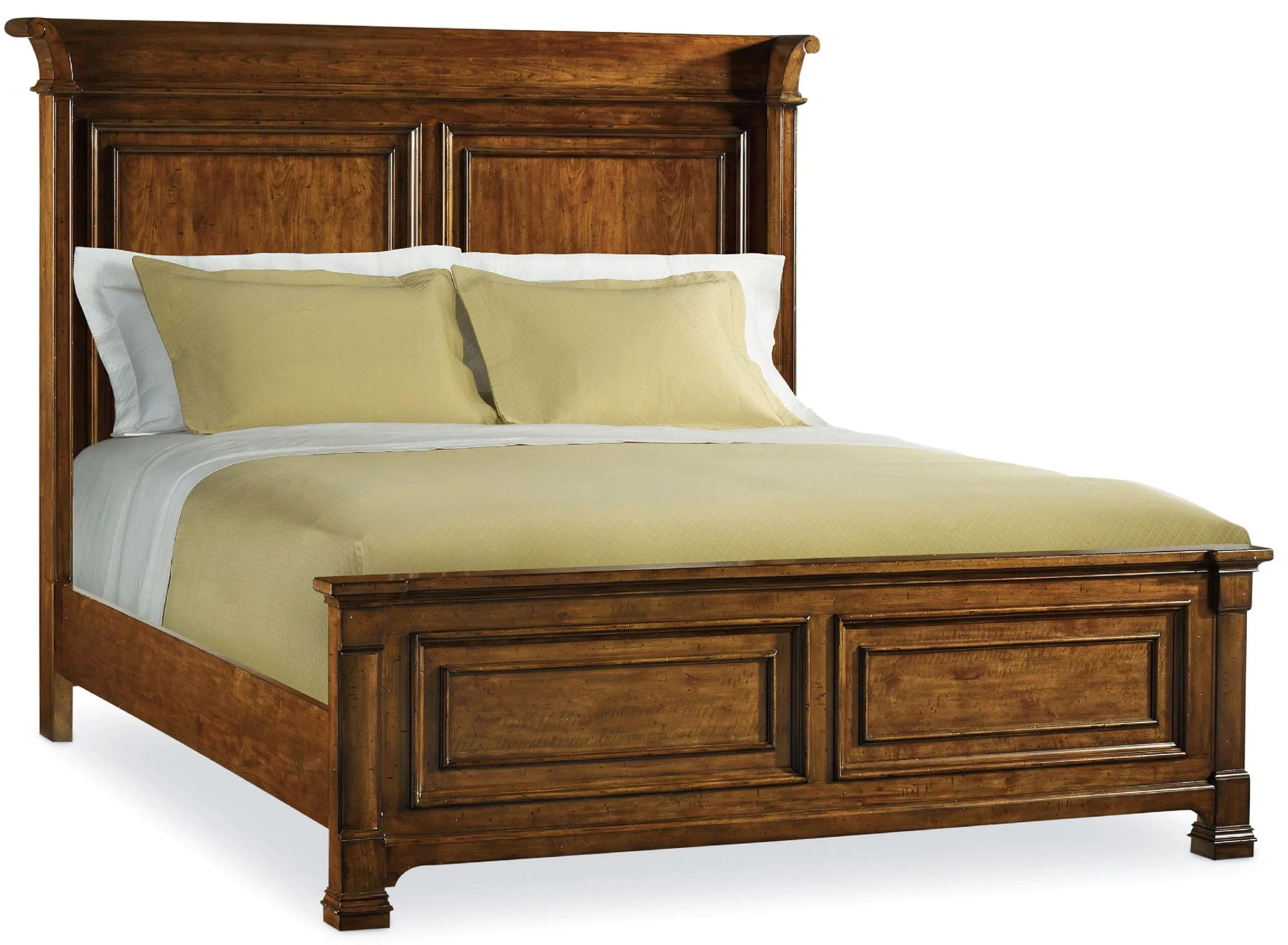 The tall headboard of the Tynecastle King Bed dramatically showcases figured Alder veneers finished in a warm chestnut-color exuding character and classic appeal. Georgian design details such as a crown-shaped top on the headboard with scroll motifs on each side offer a manor house flair.