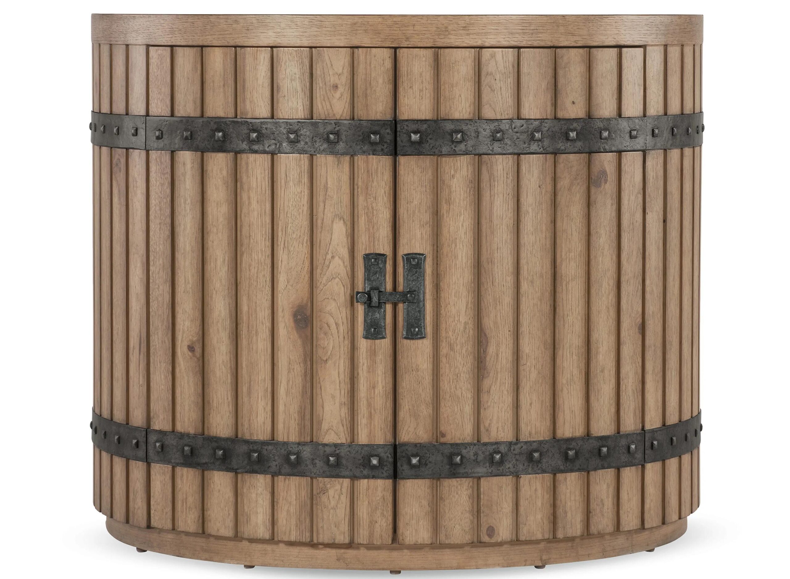 Designed in a half-circle shape inspired by a wine barrel, the Vineyard Row Demilune Nightstand is crafted of pecky hickory veneers finished in the light and airy sonoma and accented by rustic hammered metal and interlocking pulls.