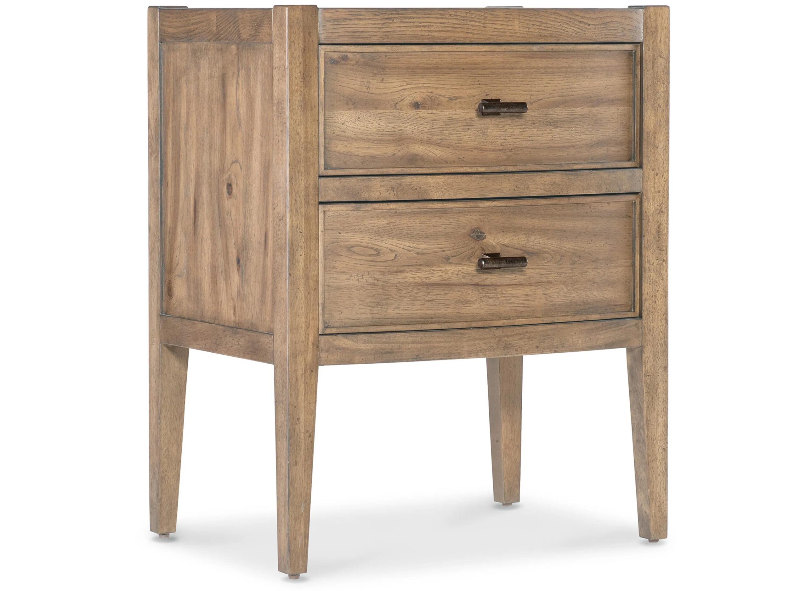 Embracing the rustic charm and organic aesthetic of Sonoma and the Napa Valley, the Vineyard Row Two Drawer Nightstand is crafted of pecky hickory and white oak veneers finished in the light and airy sonoma.