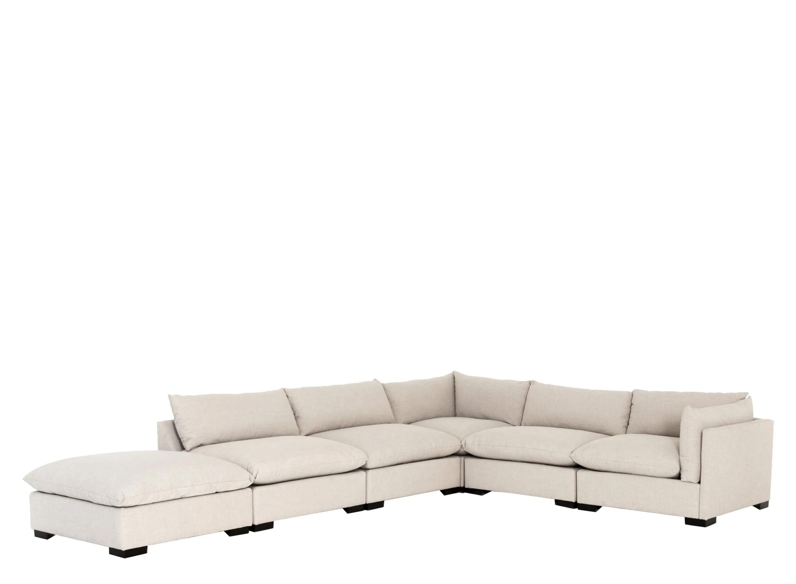 The Westwood 6-pc. modular sectional sofa with ottoman is the ultimate low-and-deep lounger. The cushioning is upholstered in an easy-to-clean high performance fabric suited for modern living.