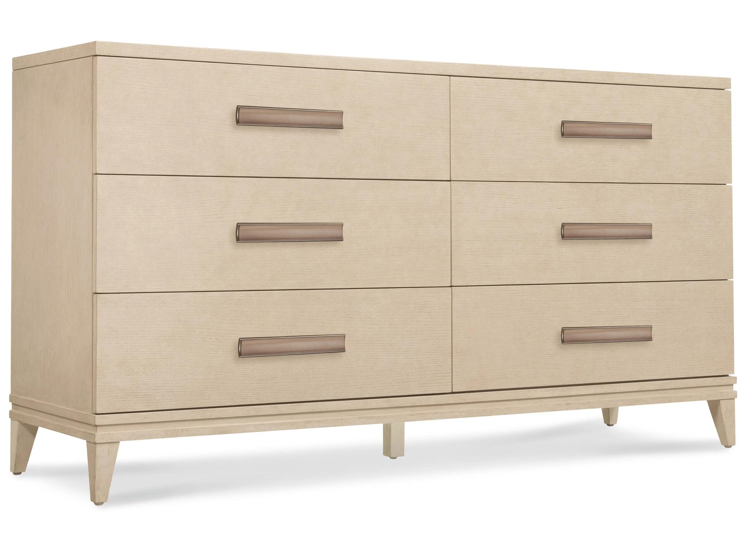 Enhance your bedroom’s aesthetic with the Westwood Six-Drawer Dresser. Crafted from quartered oak veneers with a Polished Limestone finish, this dresser features six spacious drawers, cedar-lined bottom drawers, and custom bar hardware with a plated Radiance finish.