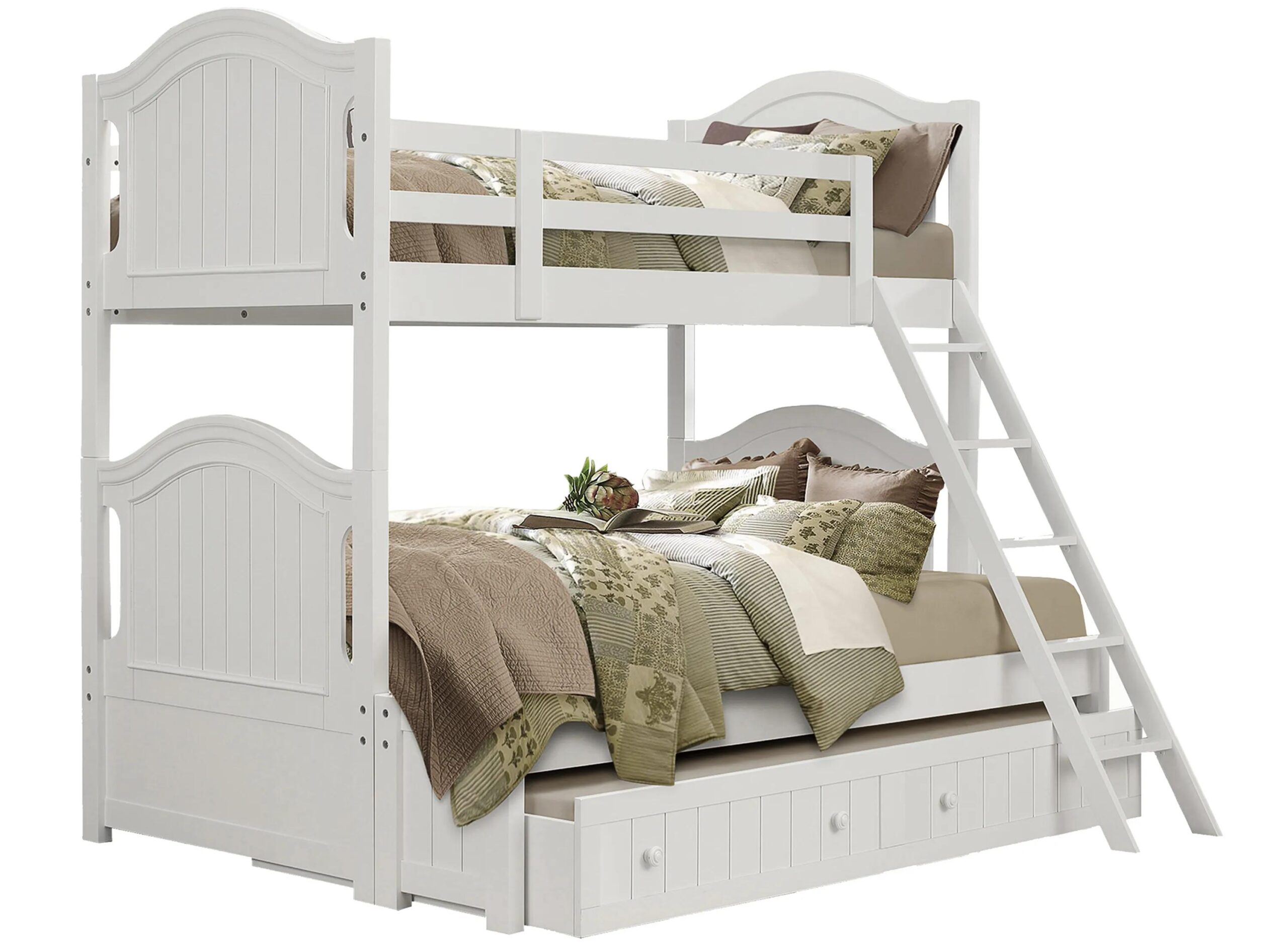 With a design as sweet as the name implies, the Willow Point Bunk Bed with Trundle will be a bright and classic addition for your children’s sanctuary. Scaled for your child’s bedroom, the twin-over-full bunkbed features framed bead-board paneling, scalloped base with turned post-supp
