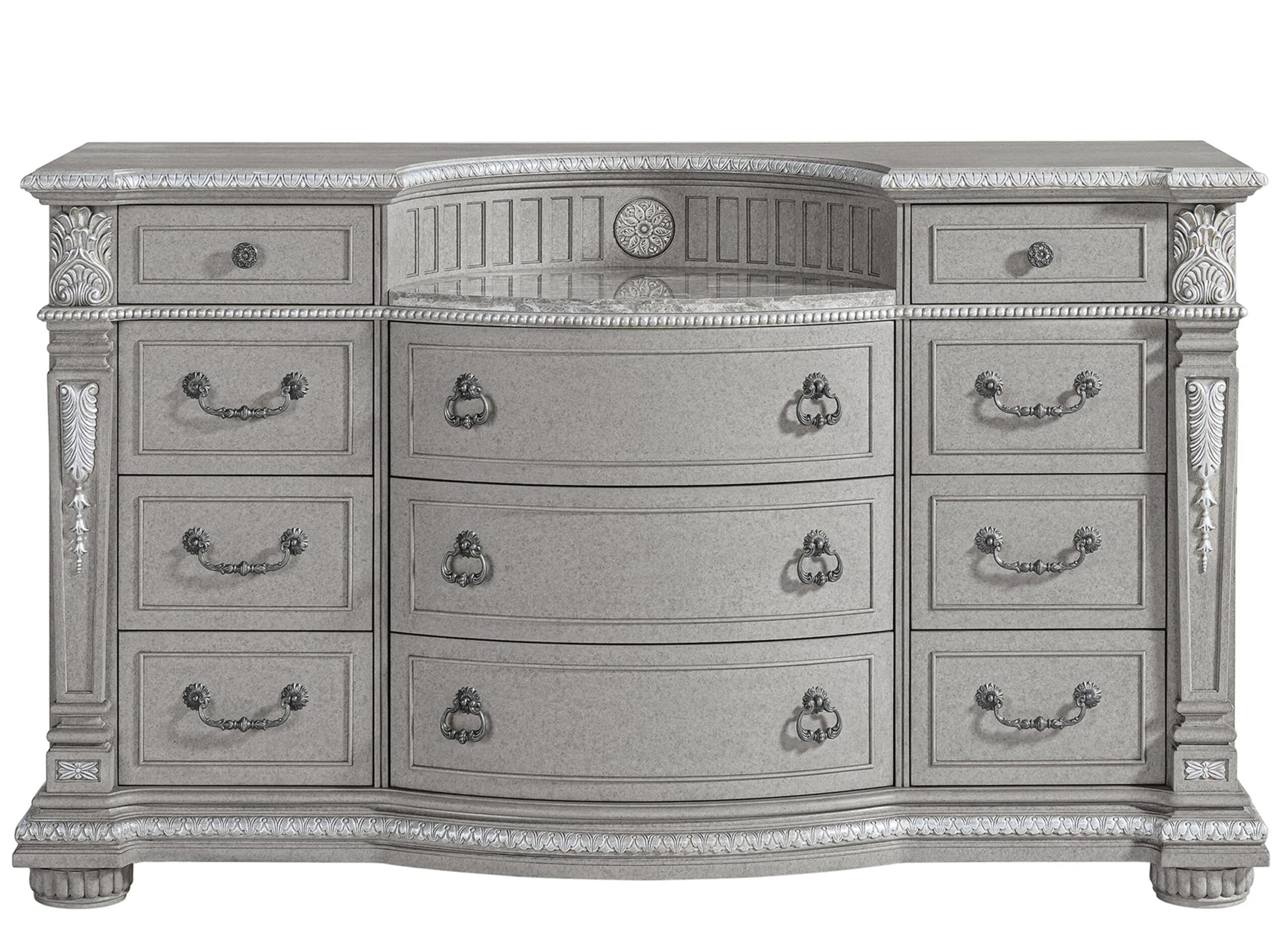 The Wilshire Bedroom Dresser is an updated spin on a familiar, centuries-old design. The sheer grandeur of periods past can be seen in its detailed carvings. Plus, a laminated marble shelf provides an added touch of luxury.