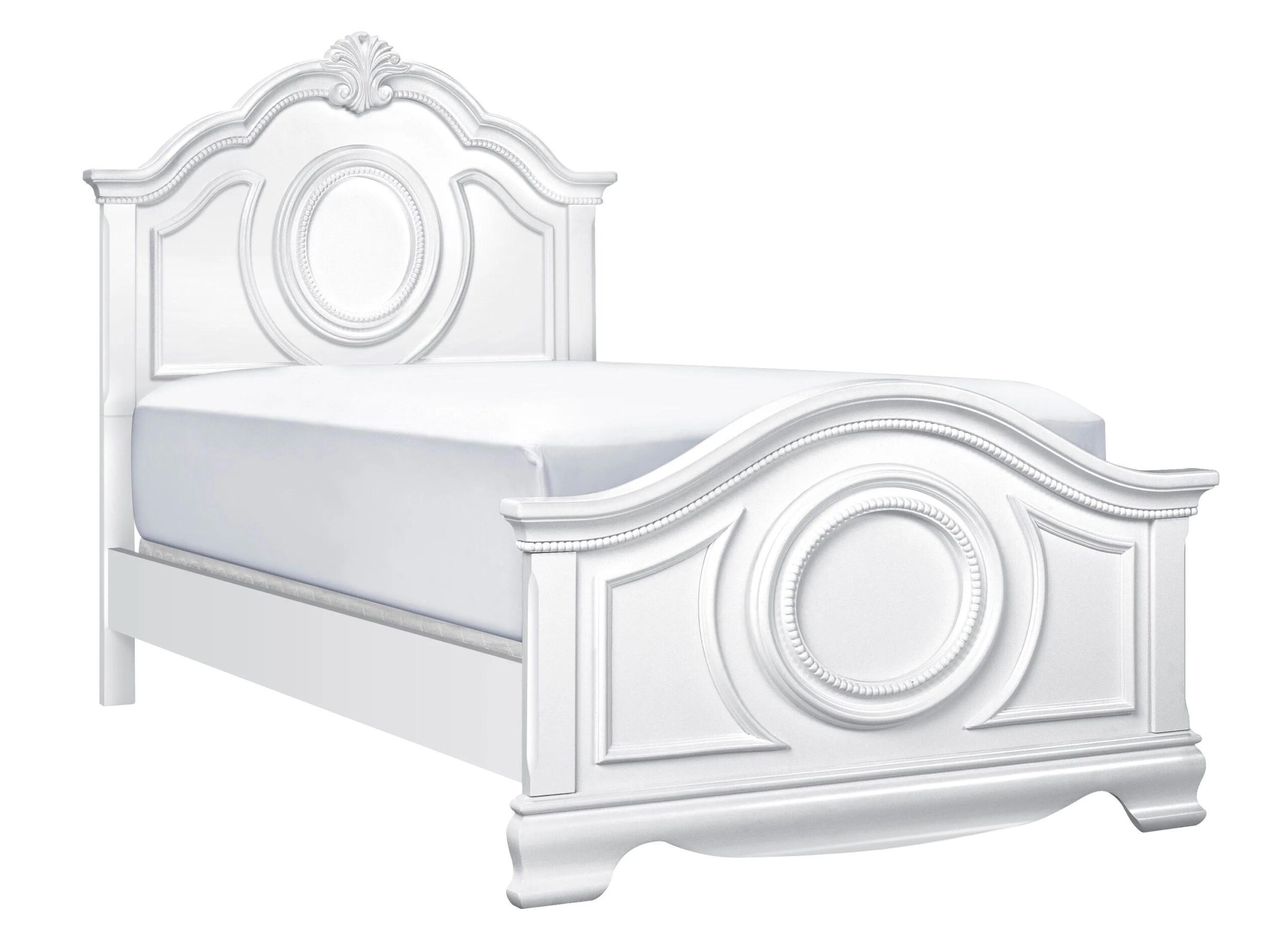 The Winnie full bed is both classically elegant and fabulously fresh, allowing you to outfit your child’s room for years to come. It’s adorned with traditional details, like a scalloped headboard, acanthus leaf carvings and beaded trim, for a truly regal appearance.