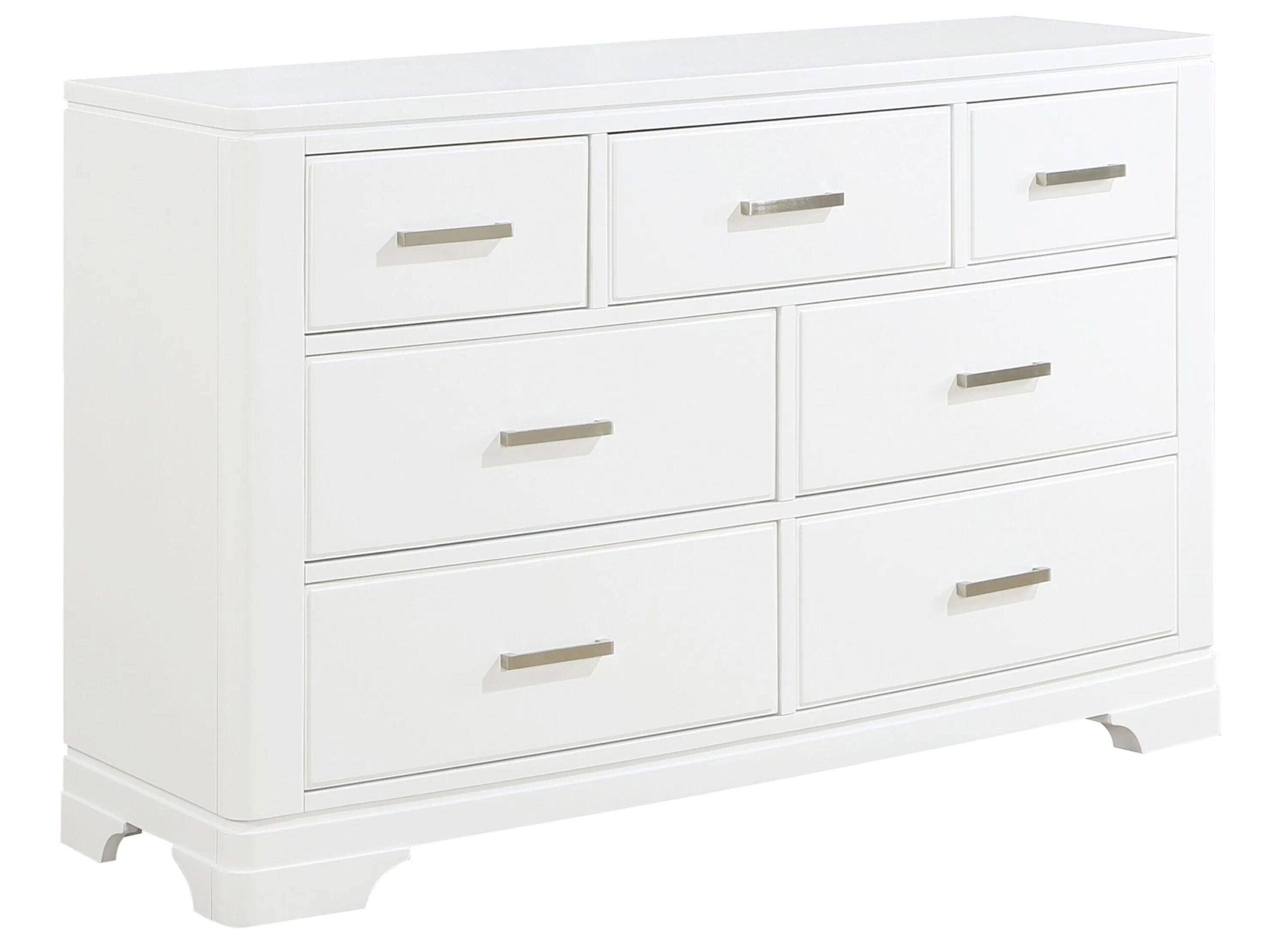 Wittenberry Dresser is white finish of the dresser presents a decoratively versatile addition to your bedroom. Polished chrome bar hardware fronts the drawers of the dresser. The intersection of modern lines and understated transitional style blend to create the Wittenberry Collection.