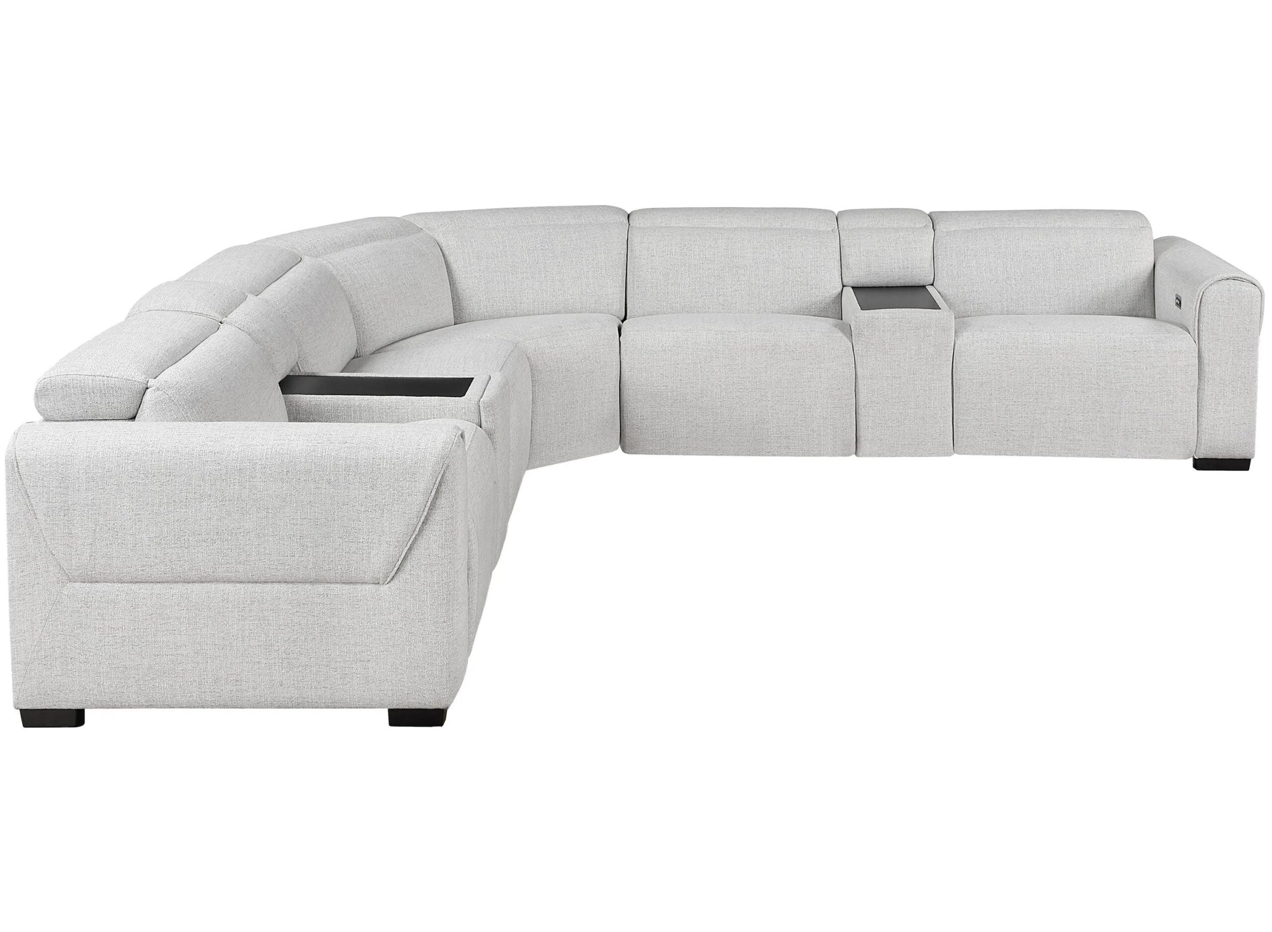 Zennia 7-pc. Modular Power Reclining Sectional features one-touch power control with adjustable positions and a power adjustable headrest, allowing everyone to find their perfect relaxation angle. Stay connected and powered up with built-in power outlets and charging ports.